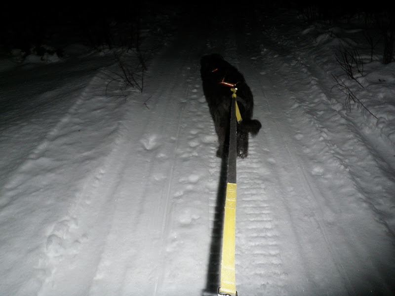 Drar pulkan lastad med bildäck varje gång jag skidar nu. Tycker det går bra, sen har jag fin draghjälp av Vega. Det är lite synd att Vega och Dixie är så olika i steget. Vega är lite piggare och snabbare om man så säger. För att det inte ska bli så struligt får Dixie därför springa lös. Vilket kan vara nog så jobbigt enligt henne 😉