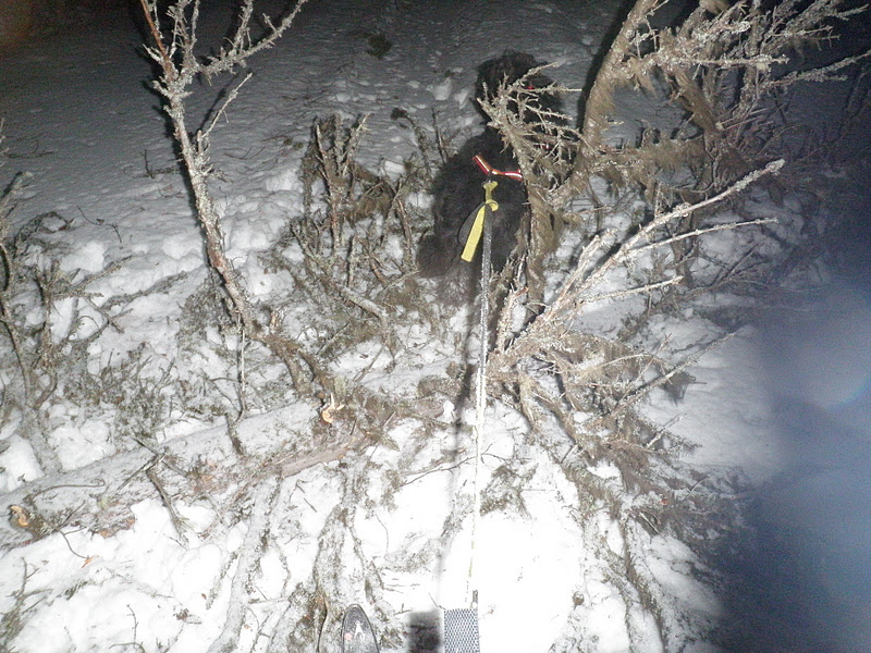 Den 27 december, alltså igår, kom stormen tillbaka. Det var förövrigt min första lediga dag från jobbet på över en vecka. Då var det alltså bara att passa på att vara ute. Jag övade på att sätta upp tältet i storm, vilket gick bra. Men att bygga en igloo gick inte riktigt lika bra. Eller det gick bra fram tills att hundarna kom på att de skulle ”hjälpa till”. De tyckte nog att det var skönare att vara inne i min lilla koja, som där var vindstilla. Dixie fick snilleblixten att börja rulla sig därinne, för att sedan trycka sig mot väggarna. Resultatet blev att ena sidan revs. När jag klev över muren för att lägga upp snöklossarna igen, tyckte nog Vega att det såg ut att vara roligare på andra sidan (alltså utsidan). Hon hoppar därför över muren, men inte tillräckligt högt och river då en sida hon också. Då vart jag leds och gav upp igloobyggandet. Gick in och fortsatte att sticka istället, håller på med ett par som jag ska maskintova. Det blir varmt och gott till turen 🙂