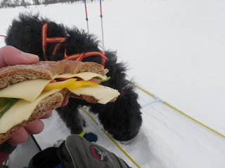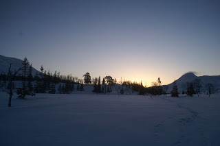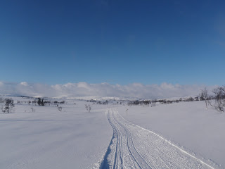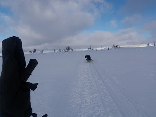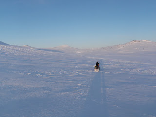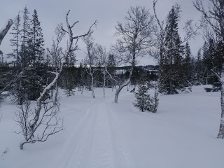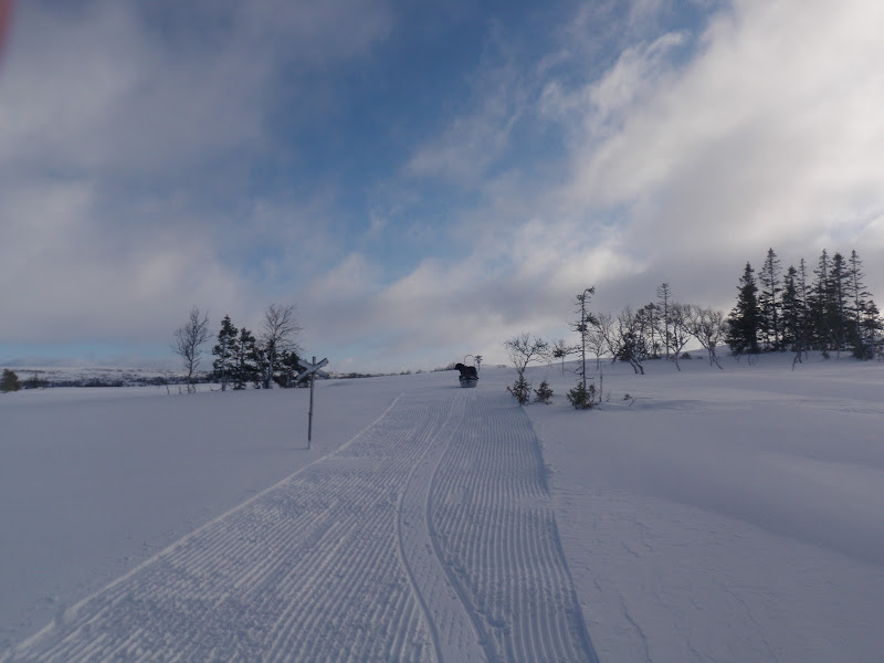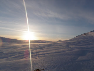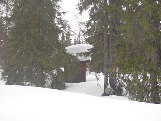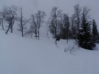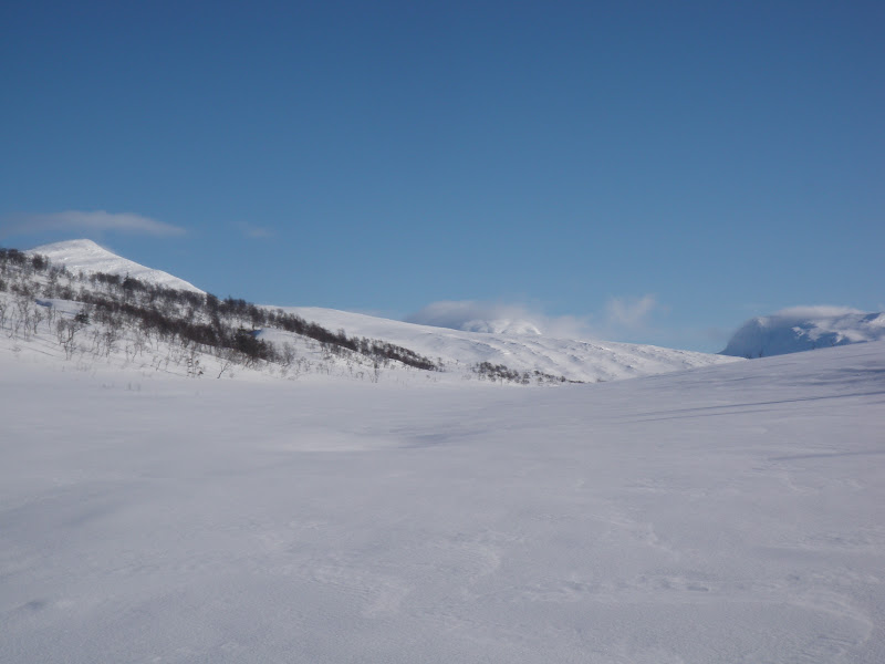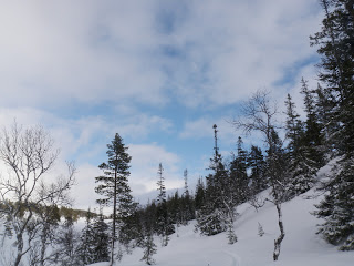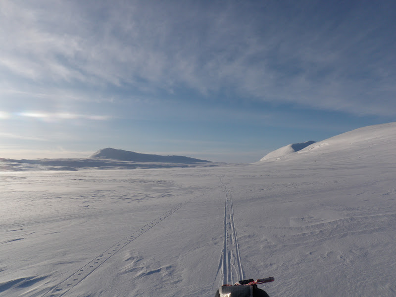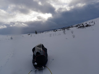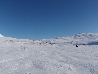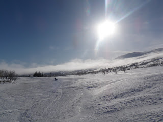 Sen gick jag över ett pass och fick åka nerför till Binnan, härligt! Vädret har varit växlande hela dagen, har haft sol, vind, regn, snö, var för sig och allt på samma gång. Men så är det att vara till fjälls. Forrest Gumps mamma hade lika göra kunnat gjort en liknelse med fjällvädret som med en chokladask. Hur som helst är det svårt att klä sig dessa dagar, antingen känner man sig för varm eller för kall.