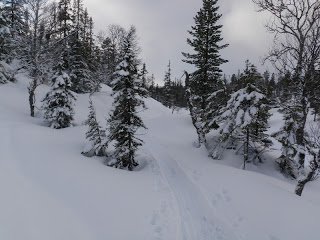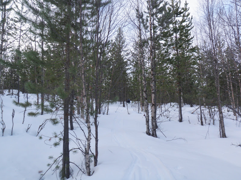 När jag sen kom till den plats där Arvattsån rinner ut i Grubbdalsån blev terrängen tricksigare och mer svårorienterad. Efter en del letande i skogen som kom hittade jag stigen som leder till Höberg, (hade inte funnit den stigen om det inte varit för att det fanns ett gammalt skoterspår på den). Väl framme i Höberg fanns färska skoterspår som jag sedan kunde följa till Lill-Kingen. Hade tänkt att skida direkt till norra änden av Lill-kingen, men jag valde att skida några extra kilometer istället för att böka en massa i den täta granskogen.