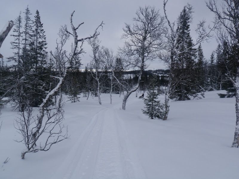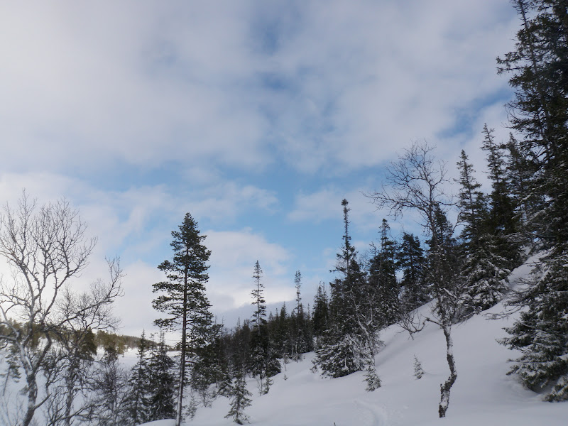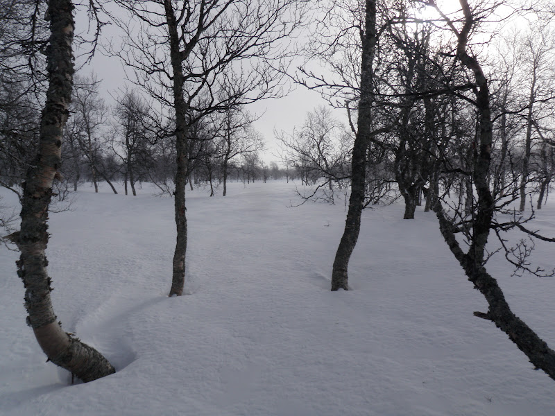 Dagen började grå. Dimman låg tät så sikten var i stort sett obefintlig. Fick börja med att leta mig upp ca 80 höjdmeter från ån, för igår slog jag läger vid ett ”vattenfall” som jag ”körde fast vid” igår. Sen väntade brant och isig utförsåkning. Vi tog det så lugnt vi kunde, så det gick i stort sett smärtfritt 🙂 Sen väntade flack fin åkning genom fjällbjörkskog. När jag kommit ner så pass lättade dimman och hela himlen sprack upp och blev alldeles blå. Frosten på alla träden började glittra, kändes helt magiskt. Lite som jag var med i Narnia och att jag när som helst skulle få se lejonet. Grubbdalen är verkligen en mycket vacker dal!