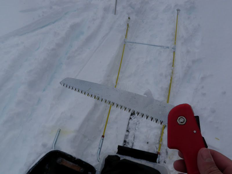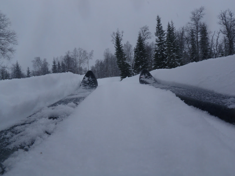 Vilken dag. Snöandet höll i sig hela natten, så på den genomvåta snön la det sig nästan 3 dm nysnö. Vega kunde inte dra sin pulka en meter idag och min bara välter. Jag fick alltså gå fram med en pulka och sen gå tillbaka och hämta den andra. Jag började gå kl 09 och gick i stort sett non-stop till klockan 17, på den tiden tog jag mig hela 4 km! Tjohoo!!! Har verkligen kommit in i en period då allt går lite ”trögre”. Mina skaklar gick av, det blir så när pulkan välter. Men lagningen blev så bra att de inte ens ser knäckta ut, jag sågade till ett rakt snitt, sen stack jag ner dem i nya bågar.