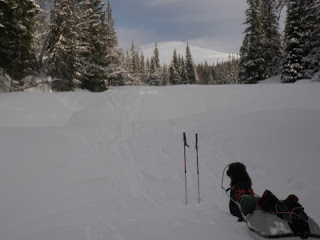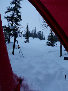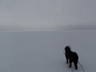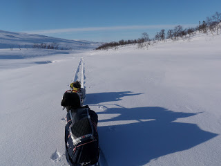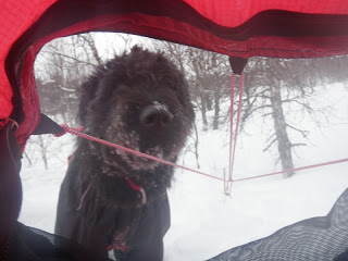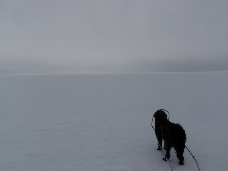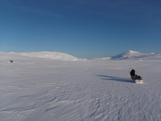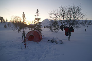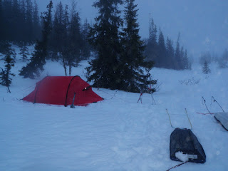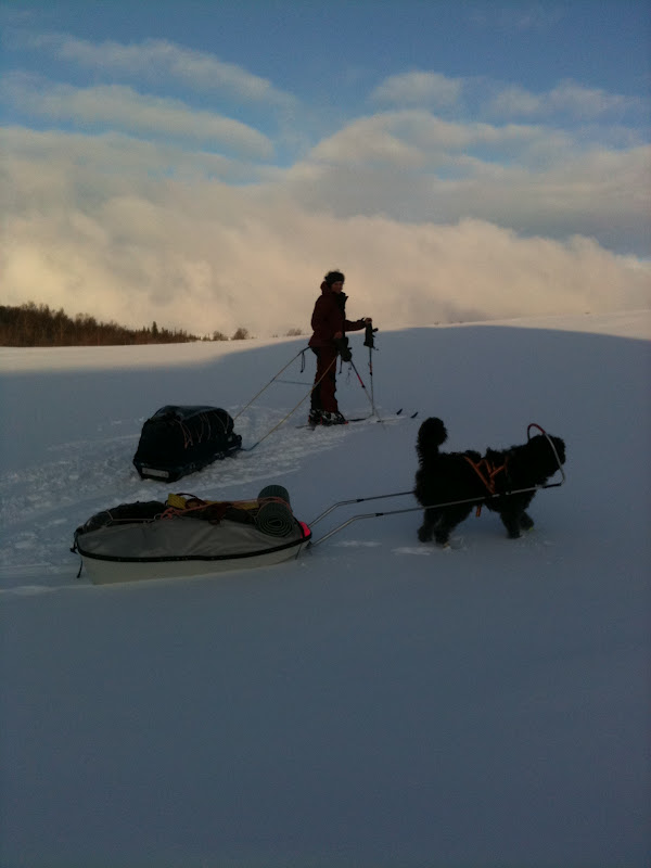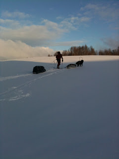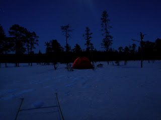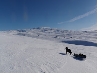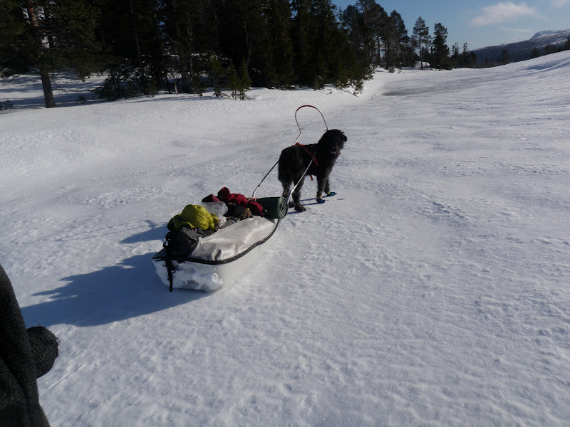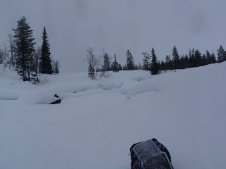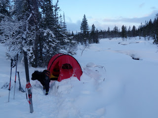 Sitter i tältet. Genomblöt. Det har regnat precis hela dagen. Mycket. Men i tältet har jag det minst sagt jättevarmt, har båda köken igång i hopp om att få allt torrt. Vilken dag det varit. Den hade en hård start, bara det att packa ihop lägret i regn är ju som det är. Började med att följa Binnan, det var lättare sagt än gjort. Min pulka bara välte, tog mig ingenstans. 200m = 1 timma. Visste inte vad jag skulle göra och gråten kändes inte långt borta. Men det hjälper ju inte, det enda man kan göra att intala sig att det snart blir bättre och på andra sätt hålla modet uppe. På min kartan såg det ut som om Binnan skulle ringla sig fram på relativ platt terräng, det gör den inte. På några ställen var jag tvungen att kravla mig upp, verkligen kravla för det var så brant. Men lyckokänslan som infann sig när jag väl kom upp var stor. Öster om Binnan var det ganska fint att gå, flera myrar. Hittade ett gammalt skoterspår som jag sedan följde. Vid det såg jag några spår som jag tror kan ha tillhört en varg. Steglängen var större än Vegas och tassavtrycken liknade hennes. Det är en bra bit till närmsta bebyggelse och vad skulle en ensam hund göra där? Skoterföraren kan måste ha kört skoter några gånger tidigare tror jag, för den hade kört ett minst sagt brant parti ner till Gaunviken. Det var så brant att jag fick vinscha ner en pulka i taget och sen lyfta ner Vega. Jag tog mig ner först (efter pulkorna så klart) sen fick jag ropa fram Vega till kanten och då kunde jag sträcka mig upp och nå henne. Tur att vi varit på många toppturer tillsammans med tricksiga partier och att hon är van att bli buren. När kommit ner på isen (Torrön) tog jag ut en kompasskurs till Skataudden och skidade över vattnet och sen längs med strandkanten till Edevik. Att gå på is i dåligt väder är inte det roligaste, finns nästan inget att vila ögonen på, så det är bara att hålla farten uppe. Från Edevik följde jag vägen. Hade tänkt att skida längs Holdern, men hittade inget bra ställe att ta mig ut på den, så istället gick jag längs vägen som går längs med Holdern  till Långnäset.