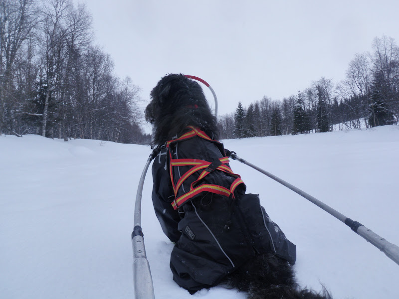 Vilken tung dag! Jag som i mitt stilla sinne tänkt att idag blir en lättsam dag, skulle ju i stort sett bara följa en älv. Isen låg fint på Strådalsälven så jag kunde utan problem gå på den. Men det är så mycket snö! Det snöade hela förmiddagen. Vi gick för allt vad vi var värda, men efter tre timmar hade jag kommit tre kilometer. Några passager längs älven var lite svårframkomliga. De var på de ställen där det var ”nivåskillnader”, då var det bara att kämpa sig upp på land, många sidor var branta. Men det gick 🙂 Vega hade det tungt i snön, hon fick mer eller mindre simma fram. Ibland kopplade jag ihop hennes skaklar med min pulka så att jag kunde hjälpa henne men hon fick fortfarande gå med den själv. Ibland fick jag helt enkelt gå dubbelt, gå fram med en pulka för att sen gå tillbaka och hämta den andra.