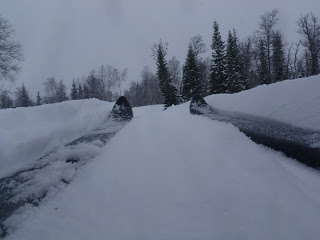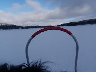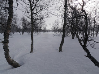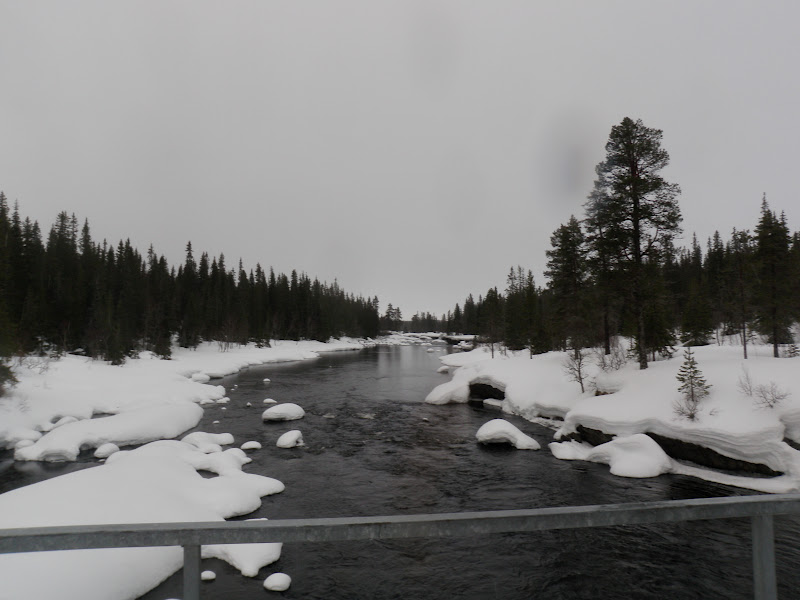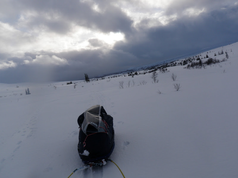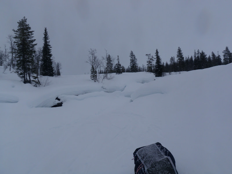 Även idag vaknade jag till ljudet av regn. Inte allt för uppmuntrande. Inte alls faktiskt. Men men, jag vet att allt känns bättre bara man kommer upp och igång. De första kilometerna flöt på bra, inga som helst problem (längs plogad väg). Men efter att ha kommit ut på vägen som leder till Långnäset blev det värre, den var oplogad och ojämn. Det gillade inte min pulka, så det välte, välte och välte. Sa jag att den välte? Jag kan inte beskriva med ord den frustration som uppstår inom mig när det blir så, jag tar mig inte 15 meter förrän pulkan ligger på sidan. Den blir måna tippningar på några kilometer. Någon som vet hur man då ska göra för att hålla humöret uppe? Efter ett tag hittade jag iaf något som liknade en lösning, jag kopplade fast mig i skaklarnas mittparti istället, då kom jag längre mellan vältstoppen. När jag sen kom ut på Jävsjön gick allt bara bra igen, den låg så fint platt och slät:) Lycka! Att regnet fortfarande envisades med att hålla på var inte så kul, men jag tog mig framåt de 7 km över isen utan problem iaf! Jag skidade sen in vid Björkvasselva/Björkvattsån som leder till Björkvattnet. Just som jag kommit ut på ån ändrades vädret. Till det sämre… Det började kräksnöa. Föret ändrades till sådant som gör att det nästan är omöjligt att ta sig fram, snön fastnar på allt; stavar, skidor, pulkor och allt börjar väga bly.