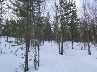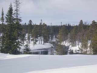 Terrängen har bitvis varit riktigt eländig idag. Skogen längs ån är tät och terrängen mycket kuperad. Det snöade hela förmiddagen, men jag hade nån liten timme med bra väder under eftermiddagen. Det var bra! Fick höra fågelkvitter för första gången idag! Våren är här:)