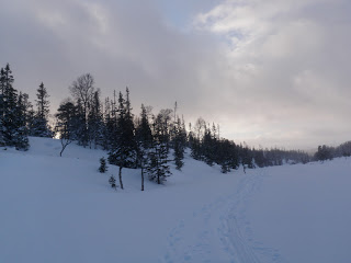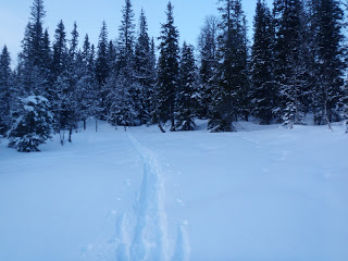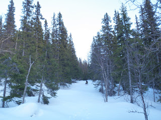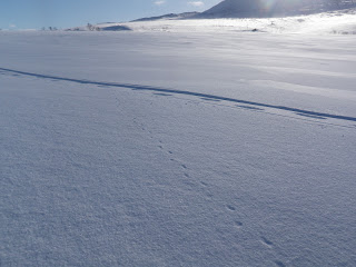 Längs strådalsälven verkar det vara full rulle, såg verkligen hur mycket spår som helst! Ren, älg, hare, räv tillhörde några av de spåren. Just som jag tänker, ”de här spåren ser verkligen färska ut” får jag se en älgko med två kalvar alldeles framför mig. Jag ropar till så att de ska försvinna ”Hey, jag är en människa, men ni behöver inte vara rädda jag är vegetarian, men jag skulle uppskatta om ni kunde flytta lite på er”. De gjorde som de blev tillsagda.