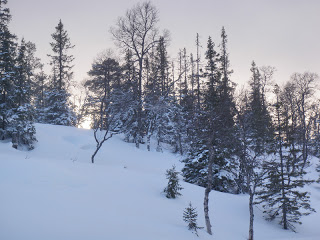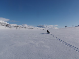 I morse vaknade jag till ljudet av regndroppar mot regnduken. Trött kollade jag på klockan som visade nästan 08.00. Jag hade alltså ”försovit” mig. Klockan hade varit på snooze sen 07.00. Har varit lite trött de senaste dagarna, eller seg snarare. Hade iaf tur för just som jag skulle packa ihop lägret blev det uppehåll i regnandet! Jag hann få på mig skidorna och skida några meter ner till älven. Då började det snöa ett härligt snöblandat regn. Föret som var gjorde att jag inte tog mig framåt, min pulka bara välte och Vega tog sig inte framåt då snön var för djup. Jag fick alltså gå i två omgångar, först fram med en pulka sen gå tillbaka och hämta den andra. Det var så tungt, visste inte vad jag skulle göra. Till slut skrek jag bara rakt ut. Tro det eller ej, men det löste inga som helst problem. Med den sinnesstämningen som infann sig i min kropp blir det heller inte lättare. Jag fick alltså tänka om, sa till mig själv att le och försöka tänka glada positiva tankar. Det gick sådär. Så jag pluggade i musik i öronen, i vanliga fall försöker jag undvika att lyssna på musik. Känner att den gör mig mindre ”närvarande” i naturen. För mycket av naturupplevelser sitter i hörseln, eller alla sinnen är viktiga för en komplett naturupplevelse. Efter två timmar hade vi kommit en kilometer. Helt sjukt tungt. Men vi tog oss iaf framåt! Efter ett tag kom jag upp på lite höjd ungefär vid Bijjie Klockar, där blev föret bättre (hårdare) och Vega kunde åter gå med sin egen pulka. Idag fick jag se något helt galet vackert, ja rentav magiskt. Alldeles framför oss lyfte 38 ripor och flög iväg. Efter det vände mitt humör på riktigt.