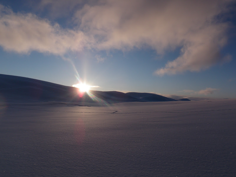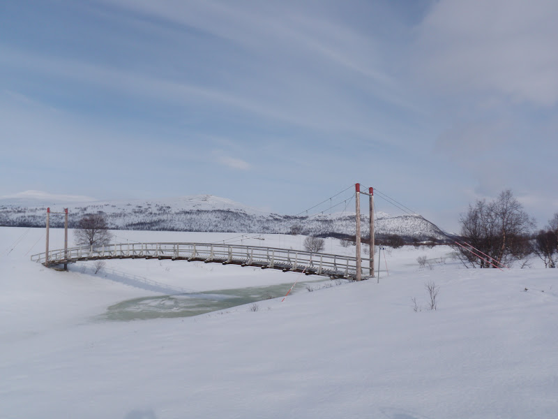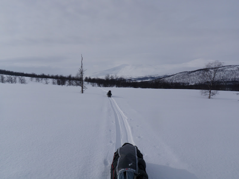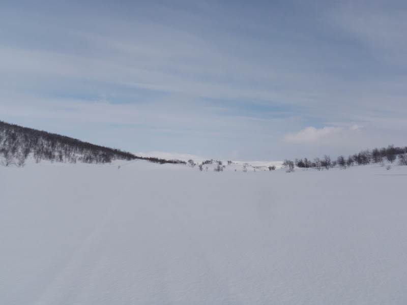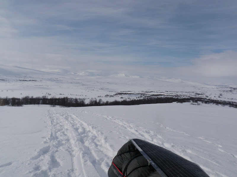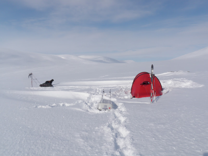 Natten var kall och vindstilla. Riktigt kall tom. Det var fortfarande kallt på morgonen, då är det inte helt lätt att motivera sig till att kliva ur en varm och skön sovsäck. På morgonen var det helt klart och jag hade stora förhoppningar om dagen. Men efter bara en halvtimme täcktes hela himlen med moln och hela dalen av dimma. Men när jag kom fram till Vindelkroken sprack det helt plötsligt upp. Det gillas. Där skulle jag gå upp över en knix på 80 höjdmeter. Upp på den knixen lunchade jag och hade fin utsikt över dalen. Dessutom var det helt vindstilla och som sagt sol!!!! Då mår jag bra! Det är så vackert att det nästan är svårt att ta in, blå himmel och fina fjällstoppar. Efter att sedan ha gått öster om Vindelälven en bit letade jag mig sedan ner och gick på den istället. Det gick jättebra, öppet vatten på nåt litet ställe, men vakarna var så små att det bara var att runda dem.I flera km gick vi på helt utan problem, men så kom vi fram till ett litet krux. Bara att leta sig upp från älven för att ta sig förbi en 20 meter hög klippa. Klockan var då 17.00 och fram tills dess gick jag på i bara underställ! Solen har verkligen värmt, men kl 17.00 började det snöa istället. Idag var det inte så kuperat, kändes som det mest gick lite upp. 960 möh slog vi läger på precis i början av Randalen.