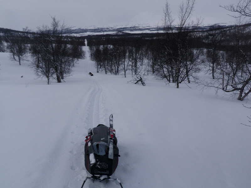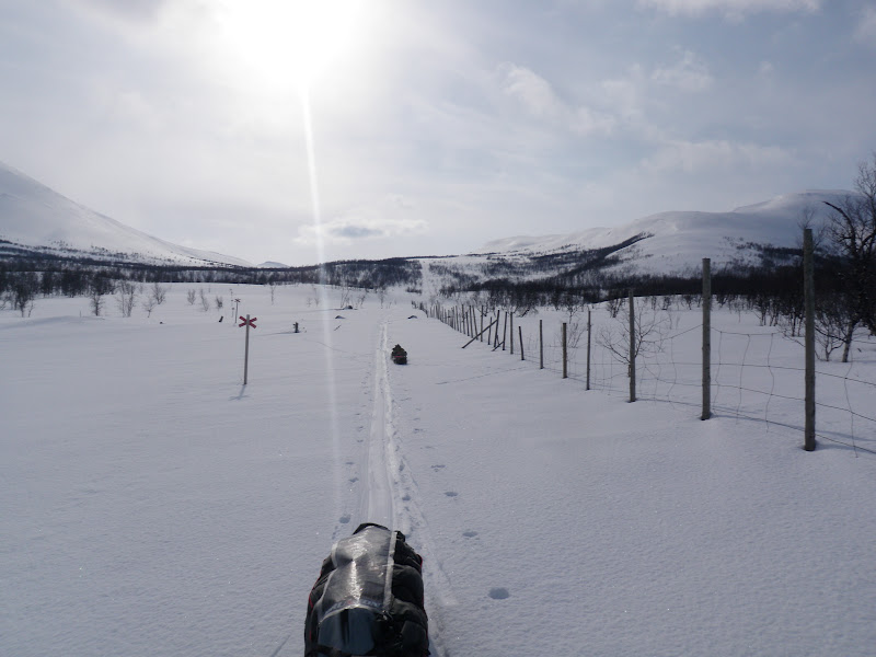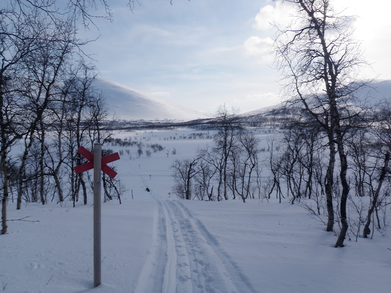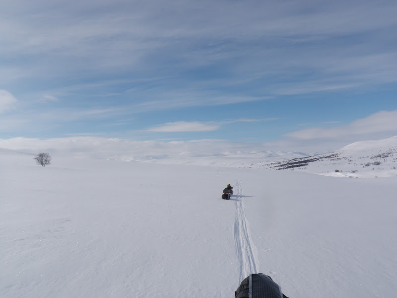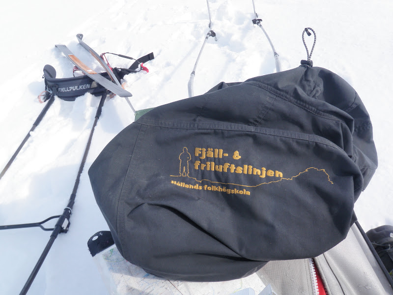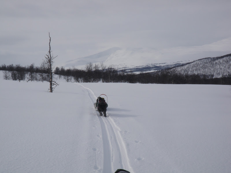 I natt snöade det, inte helt optimalt då den snön la sig på den mjuka lite sörjiga som isolation. Men jag är glad att snön kom under natten och inte på dan! När jag klev upp var det helt vindstilla, tror att det varit det hela natten också, jag har då inte märkt någon iaf. Då är det smidigt att packa ihop. Till en början var det tungt att gå, både min och Vegas pulka satt som fast i marken. Provade att skrapa under dem, men det hjälpte inte. Vi fick helt enkelt gå och ha det tungt fram till klockan 16.00. Då blev det kallare och i och med det blev också föret bättre, hårt och fint! Det har varit en vacker dag idag, vid lunch sprack himlen upp och alla moln försvann, resten av dagen hade vi helt molnfri! Endast lite vind har det varit idag. Vi började med att följa den gamla telefonledningsgatan upp till Odenkåtan. Igår var terrängen mest platt, idag har den varit det motsatta. Upp 30 höjdmeter, ner 15. Så höll det på ända till Odenkåtan. Bitvis var det så brant uppför att jag var tvungen att ta av mig skidorna och gå istället för jag gled bara bakåt. Vegas pulka har varit ”tungdragen” idag, men trots det har hon gått med den helt själv nästan hela dagen! Hon är bäst! 🙂 I de brantaste backarna gick jag bak och puttade på med staven. Vi gick ”fritt fram” (inte på led) till den punkt där leden korsar renstängslet, där anslöt vi oss till leden och följde den ner till Vindelälven. Vi gick på själva älven ett par kilometer innan vi gick upp på myrarna och gick på dem istället. Platt och fint att åka på 🙂 Precis hela dagen har vi haft sikt och därför fått se en massa vackert, lycka!
