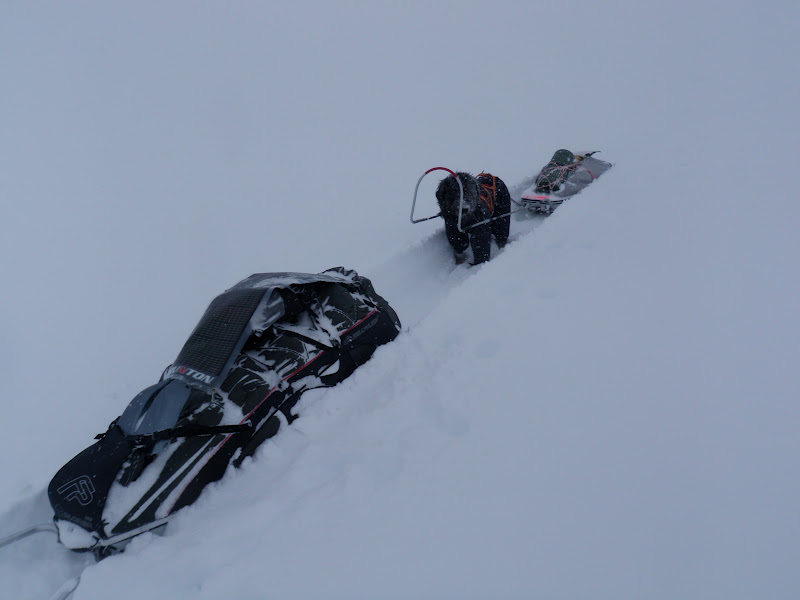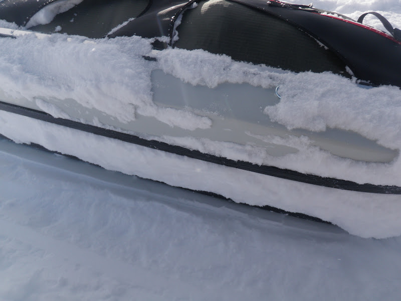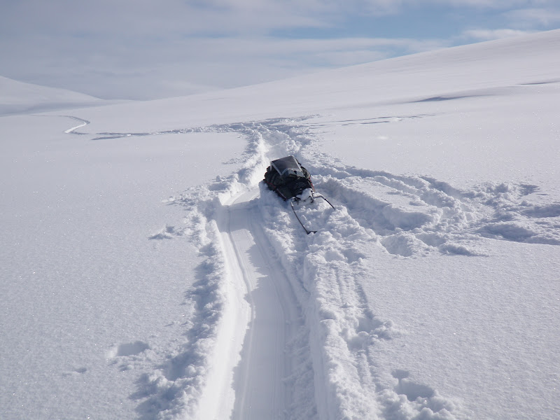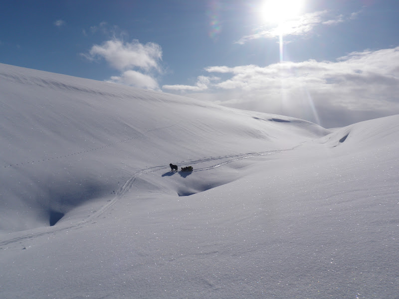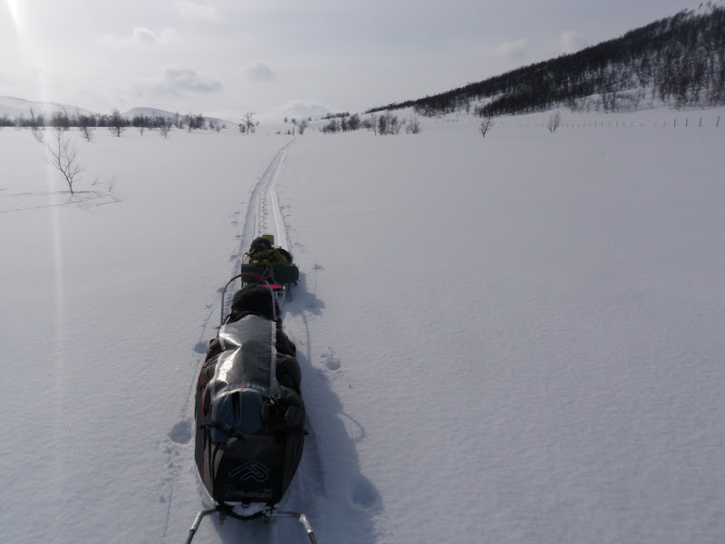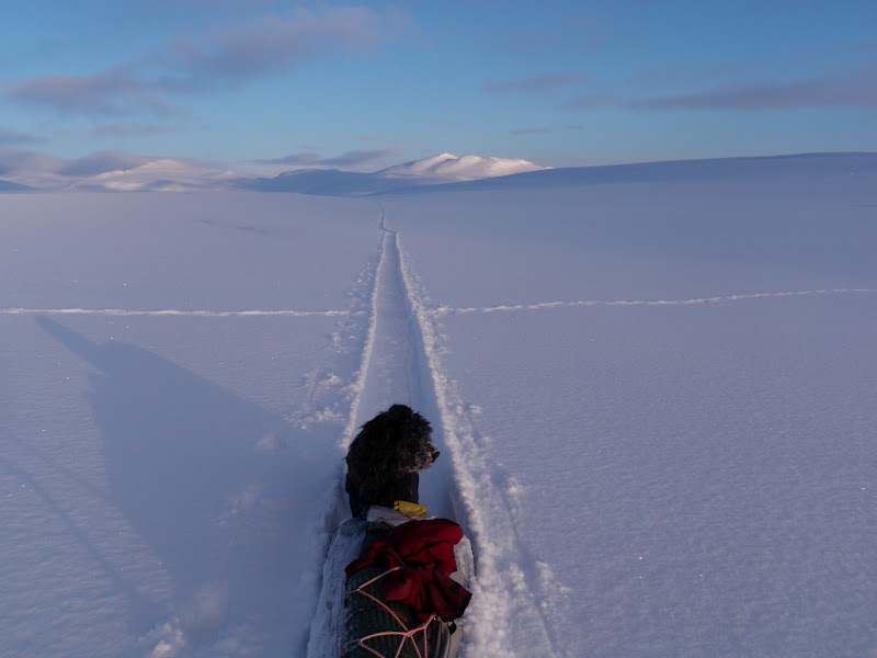 Jag packade som vanligt ihop lägret för att börja gå vid kl 09.00. Men jag tog mig inte långt. Det var noll sikt. Inga konturer av några fjäll, marken framför mig, ingenting. För att inte börja irra omkring i snöyran fick jag stirra helt på kompassnålen så fort jag vände bort blicken från den började jag gå åt fel håll. Men med all den nya snön så var det inte lätt. Med en hand om kompassen och bara en hand fri tog jag mig inte framåt. Jag gav upp efter 30 min och slog upp lägret på nytt. Snön fortsatte att vräka ner. Så jag låg i tältet och läste. Men helt plötsligt kände jag solens strålar värma upp tältet! Klockan var då 15.00, så jag tänkte att jag lika gärna kunde gå en bit. 15.30 var pulkorna packade på nytt och jag började gå. Betoning på jag kan tilläggas. Vega kom inte en meter med sin. Jag hade snö upp till knäna och kom inte mycket längre jag. Fick därför återuppta en gammal tradition. Gå dubbla vändor. Först gå med Vegas, sen vända för att hämta min. Tur att solen lyste och att omgivningen var vacker! Annars hade jag nog tappat modet helt. Jag var inte ensam om att välja just denna dalgång, ett helt gäng renar hade gjort samma val. Är så glad, stolt och nöjd över Vega som lyssnade på mig och inte sprang efter en endaste ren! Hon gick snällt bredvid. Okej, hon frågade om lov att få gå fram (ni vet, strutta lite gnällande på stället med svansen i vädret) men när jag sa nej, så lyssnade hon på det! Vi gick till klockan 20.00 och tog oss hela tre kilometer! Woop woop, det går bra nu.. Det var kallt idag. Vegas päls har varit helt täckt av frost.