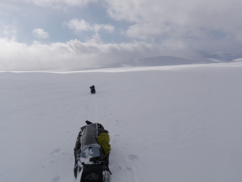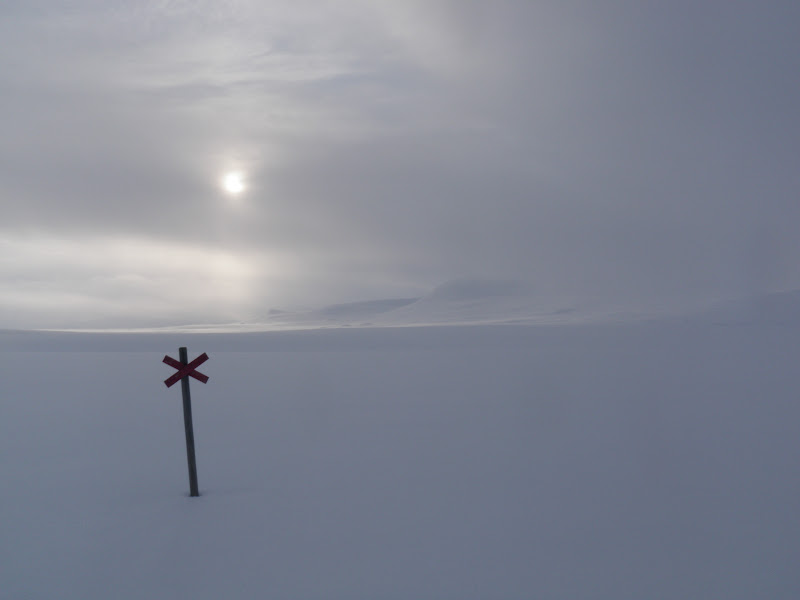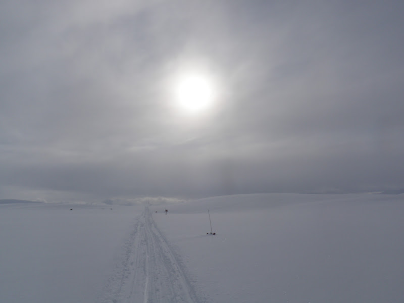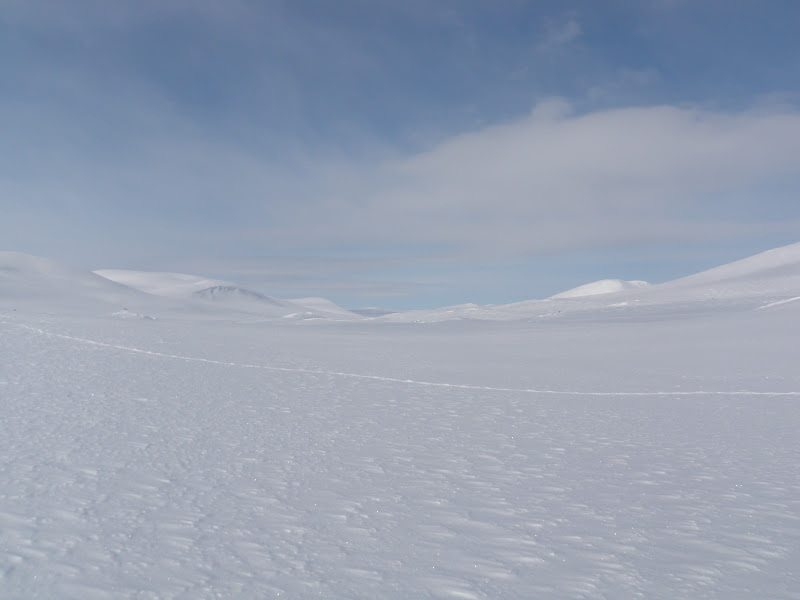 Vädret var betydligt bättre idag mot igår. Det var växlande precis som igår, men det växlande inte lika häftigt. De första 7 km från Silbbajávrrie till själva Nasa-leden (Vi sneddade fram till Nasafjällets fot) gick tungt och tog hela 6(!) timmar. Föret var inte alls roligt. Dels var snön sträv, sen så hade den nya snön inte satt sig så den åkte ideligen undan. Känslan var alltså densamma som när man har riktigt bakhalt, fast jag kunde inte valla mot det. Idag lyckades jag med något tråkigt, jag lyckades tappa min ena korta stighud. Jag vände och åkte tillbaka när jag upptäckte det, men som vi åkt i lössnö hade den försvunnit ner i den då både jag och Vega kört över den. Då var det bara att plocka fram vallaburkarna istället, vilket fungerar lika bra (om man väljer rätt valla.. det gjorde jag idag 🙂