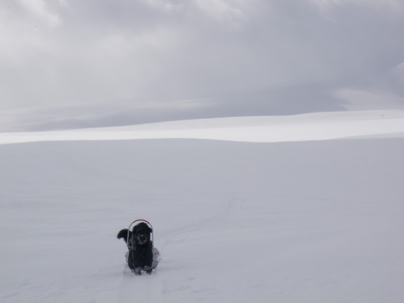 Idag har jag haft äkta aprilväder. Blåst, snöfall, solsken, i en enda blandning. Inte bra väder för Vegas päls, blåsten gör att snön letar sig in överallt och fastnar där. Hon har gått med overall idag, men den har inte hjälpt helt. Vega lade in sitt veto idag för första gången, hon lade sig ner och vägrade gå vidare. Jag hade hoppats på att ta mig upp till Nasaleden men så blev det inte. Fast i det föret som varit är jag glad att vi kom så pass långt som vi gjorde. Vi är åter i Sverige och har slagit läger vid Silbbajávrrie, idag rundade vi Gárgadasoaivi.