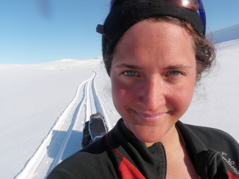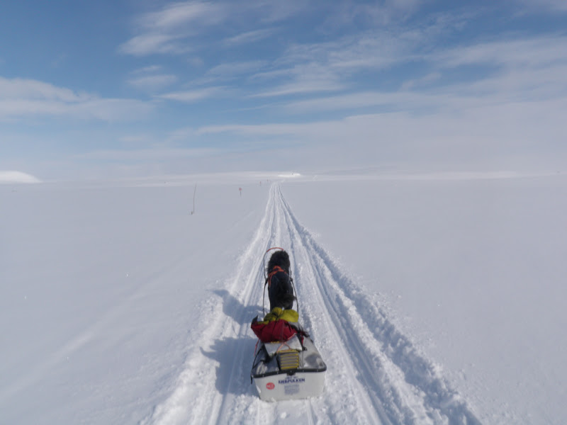 När vi började gå idag var föret precis lika tungt som igår. Med andra ord satt vi som fast. Jag lastade över en del av Vegas packning till min pulka för att underlätta för henne i den djupa snön. Hon kämpar verkligen på! När föret blir så tungt vet jag varken vad jag ska göra eller ta vägen. Jag tar i allt vad jag kan, men det hjälper liksom inte. Det är som att vara på ett löpband, man kämpar på men inte kommer man längre för det. Humör och självförtroende påverkas av det. Efter 4 timmar hade vi tagit oss mindre än 2 km. Men så plötsligt ändrades allt! Helt plötsligt låg inte snön djup, helt plötsligt hade vi hårt före att gå på! Bra före och underbart väder, vilken lycka! Vi tog oss genom den resterande delen av Randalen förbi gränsen och in i Norge. Många renar har vi sett idag också.