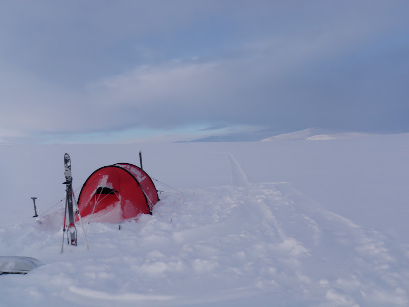 Jag klev upp i vanlig tid i morse (ingen klocka behöver ställas här inte, klockan sju prick slår jag upp ögonen var morgon), men efter att ha varit ute och kissar insåg jag att det inte ens var någon mening med att försöka gå vidare. Så jag kröp ner i sovsäcken igen. Jag tyckte att det kommit mycket snö igår, men under natten hade det kommit än mer. Klockan 10.00 var vädret helt strålande. Jag kunde alltså inte ligga kvar i tältet med rent samvete 😉 Så jag packade ihop allt och började gå. Idag gick Vega med sin egna pulka. Men jisses vad vi har kämpat. Kl. 17.00 gav jag upp, mjölksyran bara skrek i ben och rumpa. Vi hade då tagit oss 4 km i den nästan knädjupa snön. Det är inte nog med att det är massa nysnö som vi ska pulsa fram i, nej, det ska även isa under pulkorna så att det går ännu tyngre. Spåren efter oss blir djupa. Jag har hela tiden tänkt att bra väder är synonymt med bra före. Men riktigt så enkel är visst inte den ekvationen. Så tungt som det gått idag vet jag inte om jag upplevt det någon dag tidigare. Enligt kartan ska det slutta lätt utför hela dalen, men känslan är att vi ständigt går uppför.