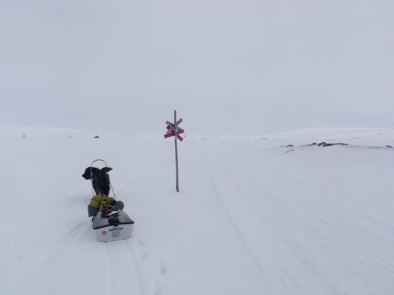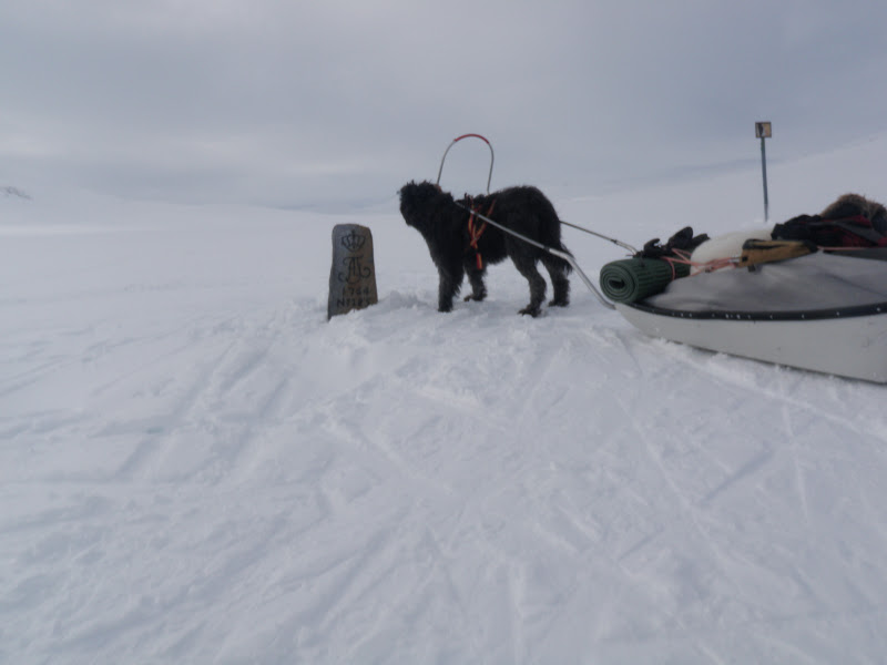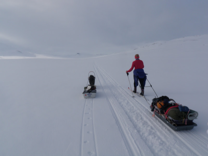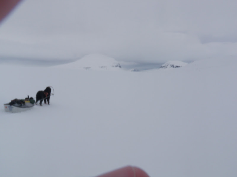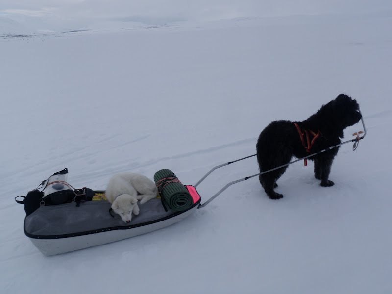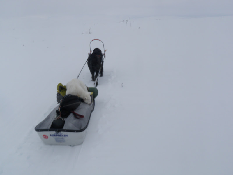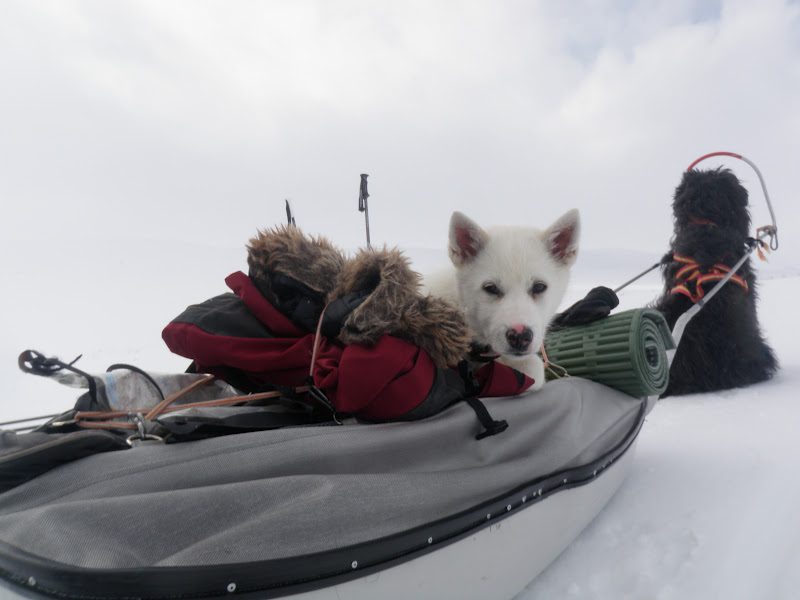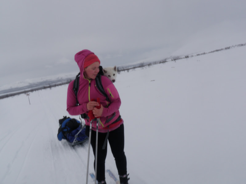 Vi tänkte att vi skulle få skida på bättre före idag, därför klev vi upp tidigare. Lykke hade tagit det här beslutet helt bokstavligt och kom in i mitt och Vegas tält redan klockan 03.00. Hur som helst så gick vi upp tidigt helt i onödan. Under natten så snöade det och den låg på marken och bara väntade på att få klabba sig fast på allt den kom åt. Skidor, pulkor och Vega.