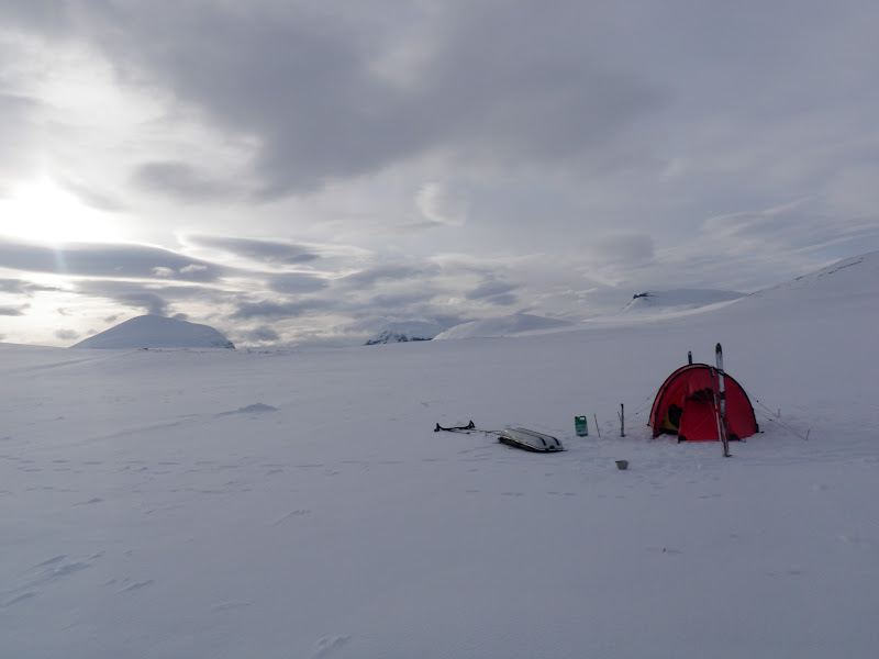 Vinden bara tilltog i styrka och började på att vara stark. Efter ca en timme hade vi en kraftig lämur och tälten uppsatte. I mitt tält blev det sjöslag då det fastnat kopiösa mängder snö på Vega som smälte i takt med att värmen steg i tältet.