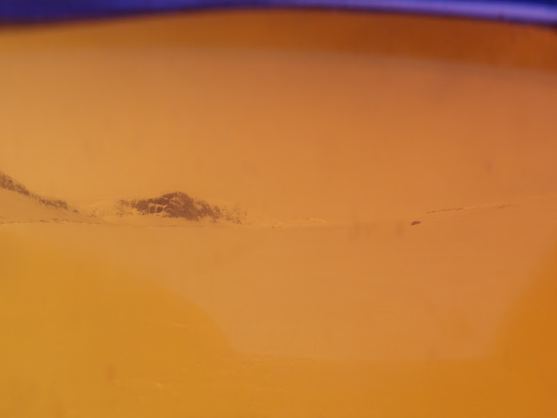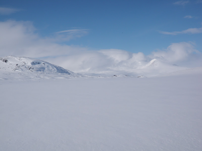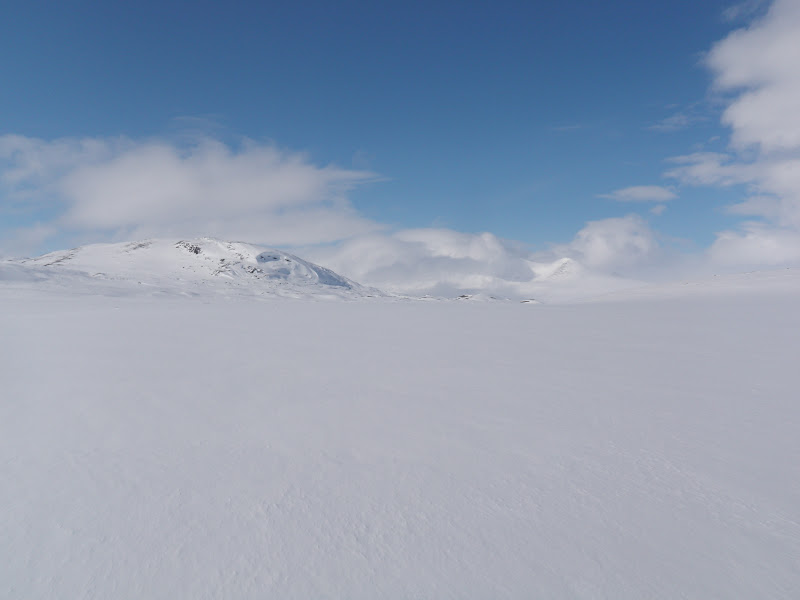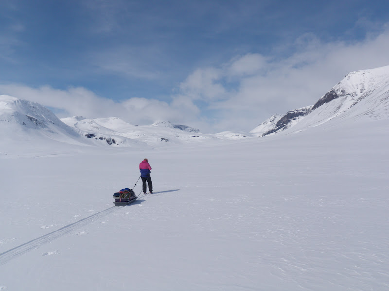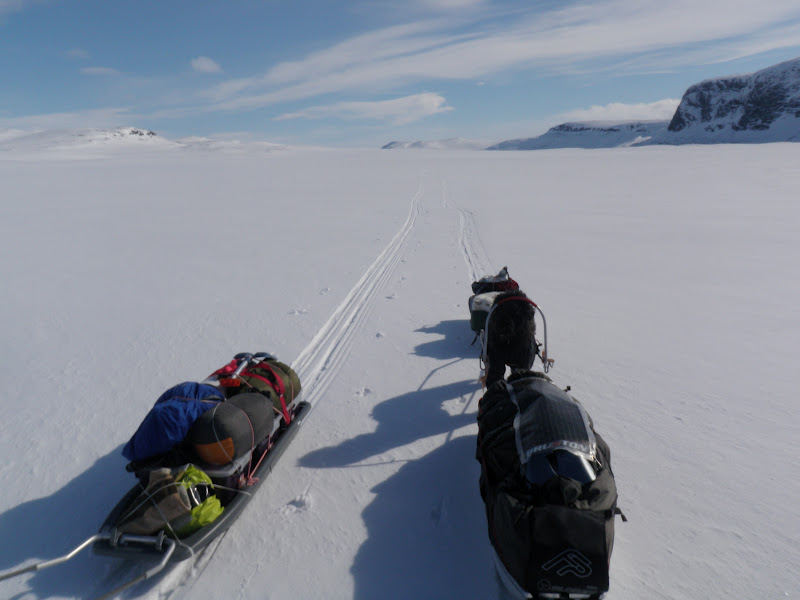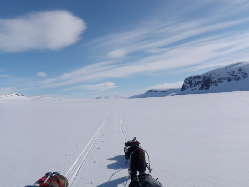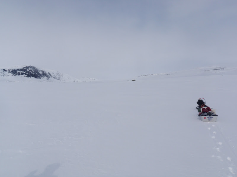 Föret och vädret var inte alls roligt när vi började gå idag. Motvind och alla 3 pulkorna satt sig fast i snön. Vi gick västerut mot Rostahytta. Fram till 13-tiden var det helt tätt med dimma och moln, men därefter sprack himlen upp allt eftersom. Vid 14-tiden var det helt klart. Vi vek av upp till Isdalen och tog de 140 första höjdmetrarna innan vi slog läger. Vilken vacker dalgång! Kan tänkas vara en av de vackraste platserna jag någonsin sett!