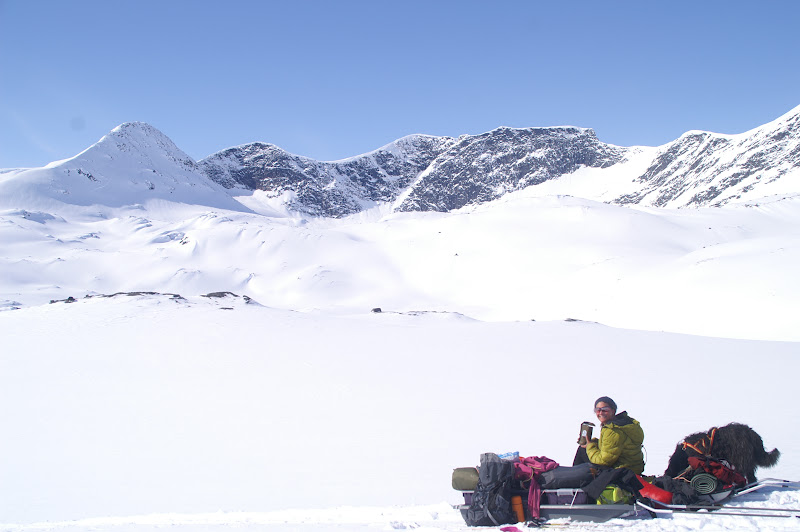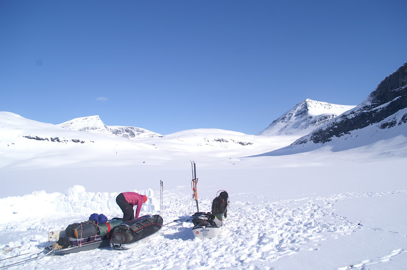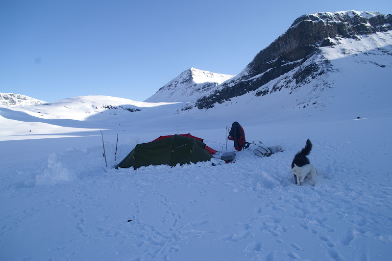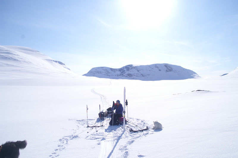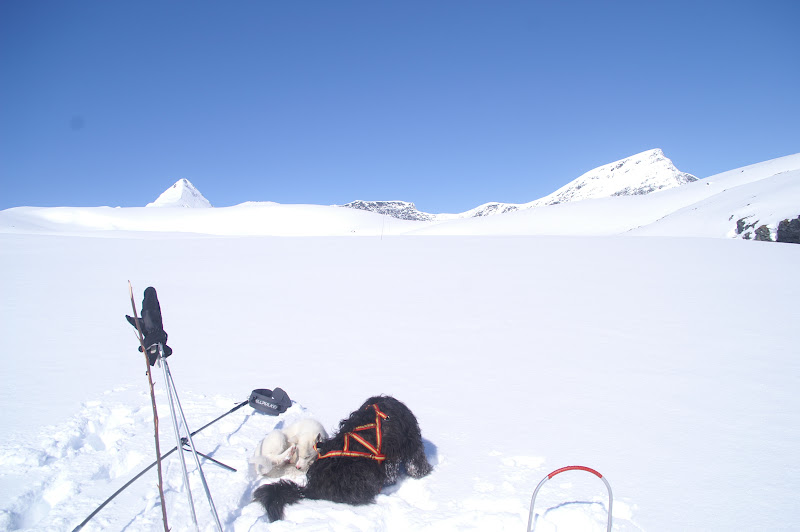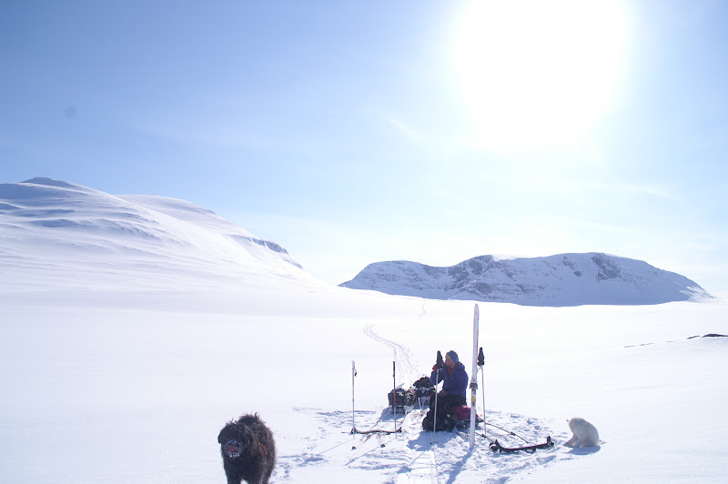 Det kändes som om alla kriterier för att få gå på bra före var ifyllda, natten var helt iskall, kallaste natten på väldigt länge. När jag slog upp vatten åt Vega frös det i skålen på en timme. Men som sagt tidigare under turen, bra väder är INTE synonymt med bra före. Om man ska tänka på bara föret så har den här dagen varit den sämsta på mycket länge. Till och med när det gick nerför fick vi kämpa för att ta oss framåt. Skidor och pulkor klabbade sig fast, Vega hade det svårt att ta sig fram tom på platten! Snön fastnade dessutom i hennes päls och inte bara lite snö satt sig fast..