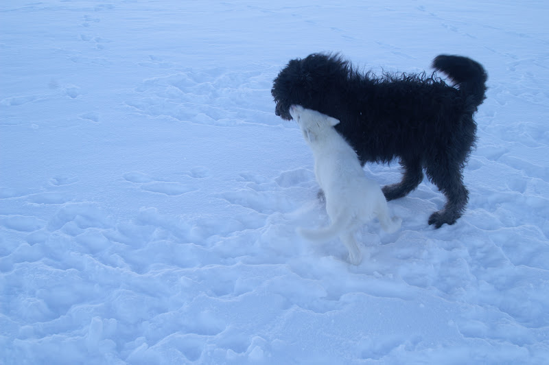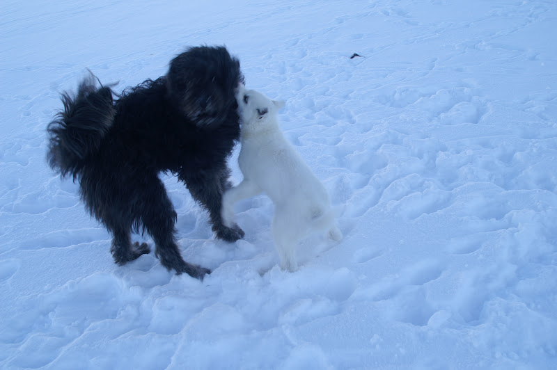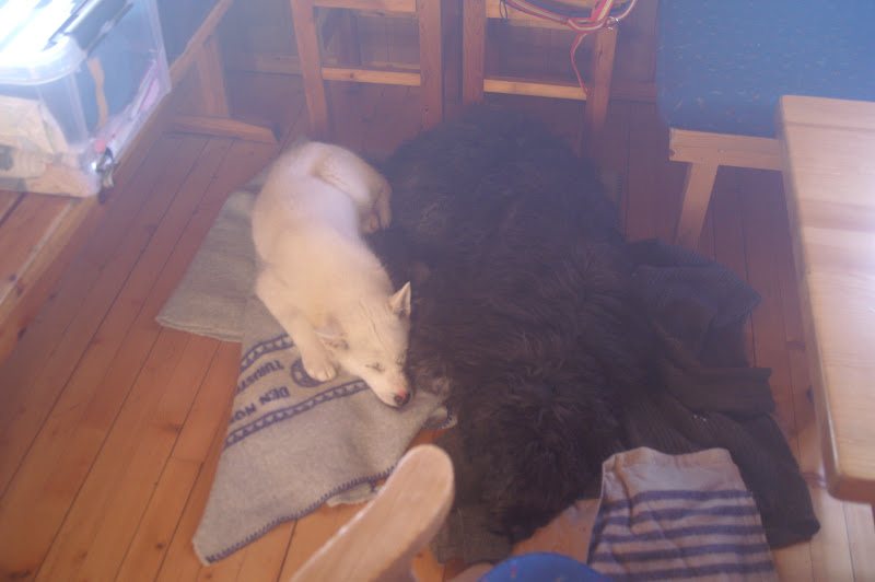 Vi packade och städade oss ur stugan för att gå vidare mot Treriksröset. Vi började gå men kom inte så långt. Efter att ha tagit de första ca 100 höjdmetrarna bestämde vi oss för att vända. Det blåste för mycket och snöade i tillägg. Vi såg ingenting och hundarna tyckte inte alls att det var trevligt, speciellt inte Lykke som fått ett irriterat öga. Vi åkte tillbaka till Pältsastugans skyddsrum som vi fick dela med finskorna vi mötte i Isdalen. Stora stugan var nu låst igen. Hundarna kunde däremot inte bo inne med oss i själva rummet som den ena tjejen var allergisk. Men det gick bra, jag bäddade i hallen till mig och hundarna så sov jag där med dem. Vega i sovsäcken och Lykke på kudden. Mys 🙂