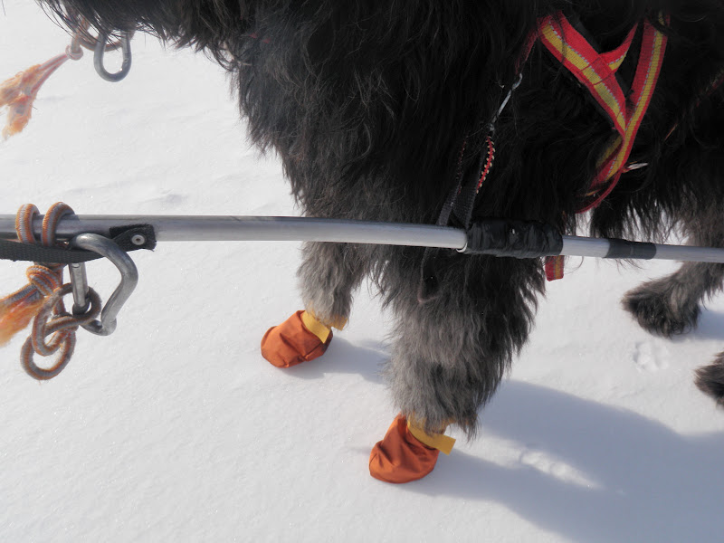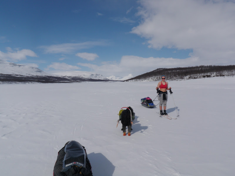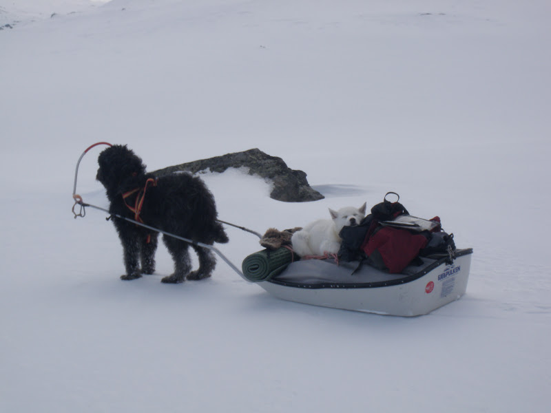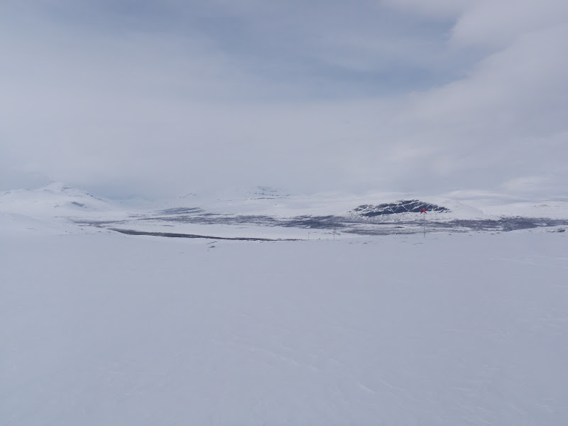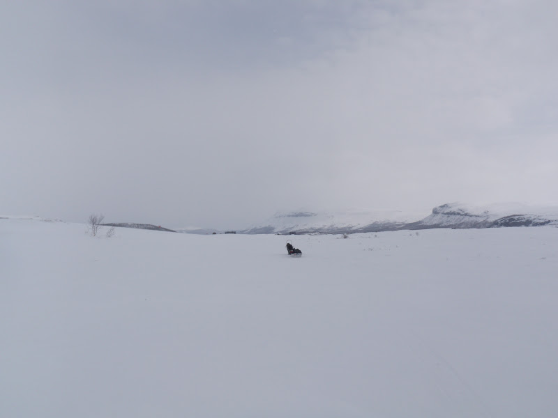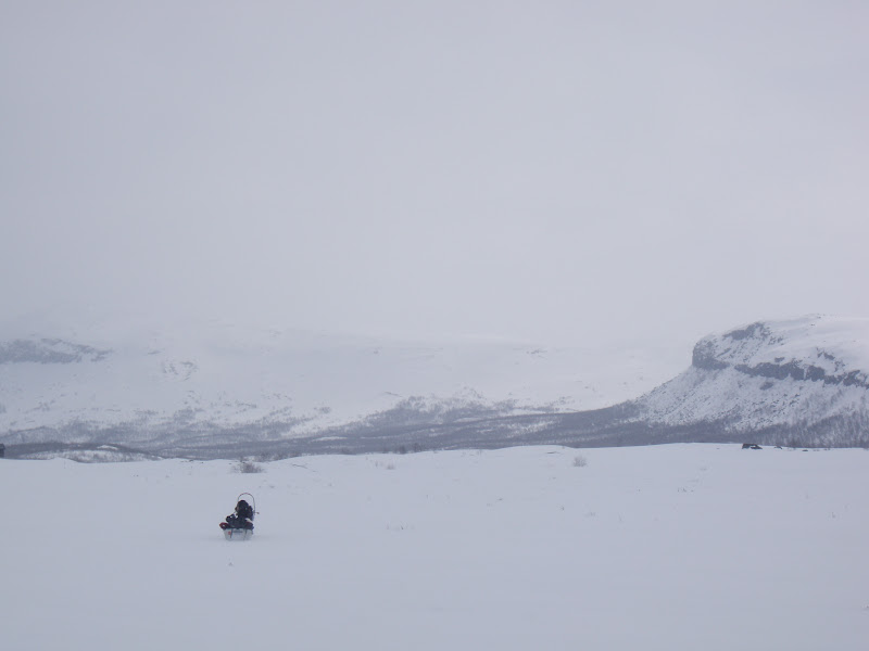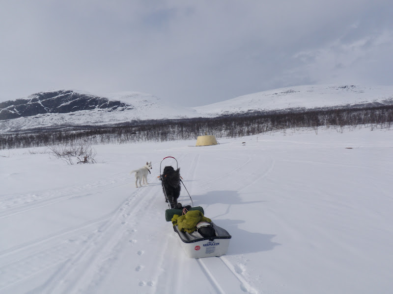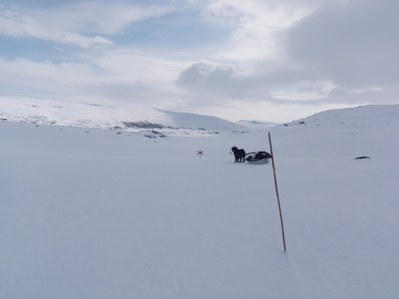 Vädret var mycket bättre idag, vinden har kommit och gått, likaså moln och nederbörd. Det är en ganska tung sträcka att gå med pulka. Det är inte platt nånstans, bara uppförs- och nedförsbackar. Nedför klagar jag så klart inte på, inte upp heller egentligen. Men som pulkan väder mer än vad jag gör själv är det riktigt svårt vissa dagar, det beror oftast inte på lutningen mest utan på föret. Är inte föret någorlunda tar jag mig inte fram med skidorna på fötterna för jag dras bara bakåt. Då är det bara att gå till fots. Det fick jag göra en del idag. Jättemånga renar fick vi se idag, vad vi fått höra skulle en stor samlad hjord på 300 renar vara just där och det verkade dem vara också. Det riktigt kryllade av dem. Det har varit med blandade känslor jag gått mot röset. På ett sätt vill jag fram, men på ett annat känner jag mig inte helt redo att lämna tryggheten eller livsstilen eller vad man nu ska kalla det på fjället. Det är något visst med att vara på tur. I över tre månader har jag nu varit ute och skidat och snart är det slut. Konstig känsla.