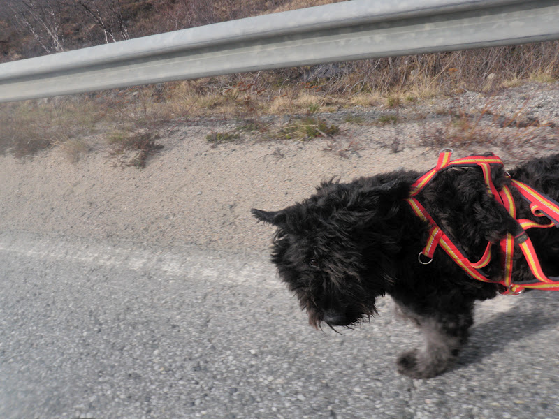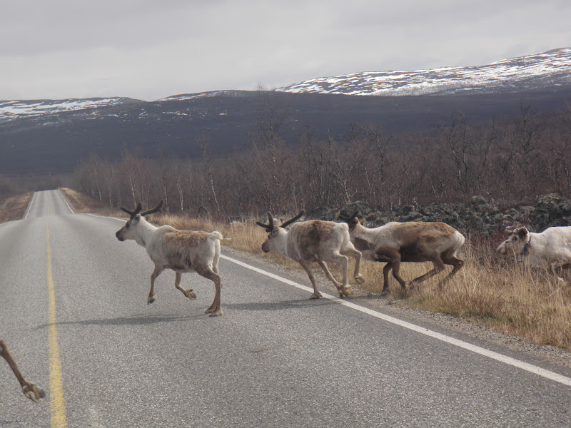 Så här i början känns cykel med packning tung, men det kommer att bli lättare och lättare för var dag som går. Maten (och chokladen) kommer att minska och jag hoppas på att bli starkare. Jag vet inte vad allt väger tillsammans, men det är en del. Bara Vega och hennes mat väger ju nästan 40 kg tillsammans. Vega fick (inte bara därför) börja med att gå/springa vid sidan av cykeln de första 15 kilometerna. Det är bäst om hon är ”nöjd” när hon lägger sig i vagnen sen. Första dagen gick över förväntan, 68 kilometer på mycket snabbare tid mot vad jag räknat med. Okej, terrängen här är relativt platt, men ändå 🙂 En bra dag har vi haft, lagom temperatur och större delen av dagen vindstilla. Många renar har vi stött på. Intressanta djur, de står fint på vänster sida av vägen, men så fort vårt ekipage närmar sig ska de så klart över till höger sida, helst springa med oss en bit. De gör ingen skillnad om Vega är i eller utanför vagnen, de beter sig på samma sätt ändå.