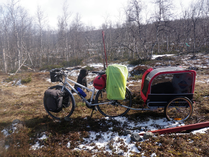 Nu har vi (äntligen) kommit igång med cyklingen! Vi blev skjutsade från ett blåsigt, snöigt och kallt Tromsö igår till Kilpisjärvi (där vi slutade att skida). Så fort vi kom över gränsen blev vädret mer stabilt, trodde jag iaf. När jag skulle gå ur tältet i morse låg där ett par centimeter med nysnö. Kallt var det dessutom i natt. Tur att jag inte skickat hem ullunderställ och dunjacka. Med dem på så frös jag iallafall inte 🙂