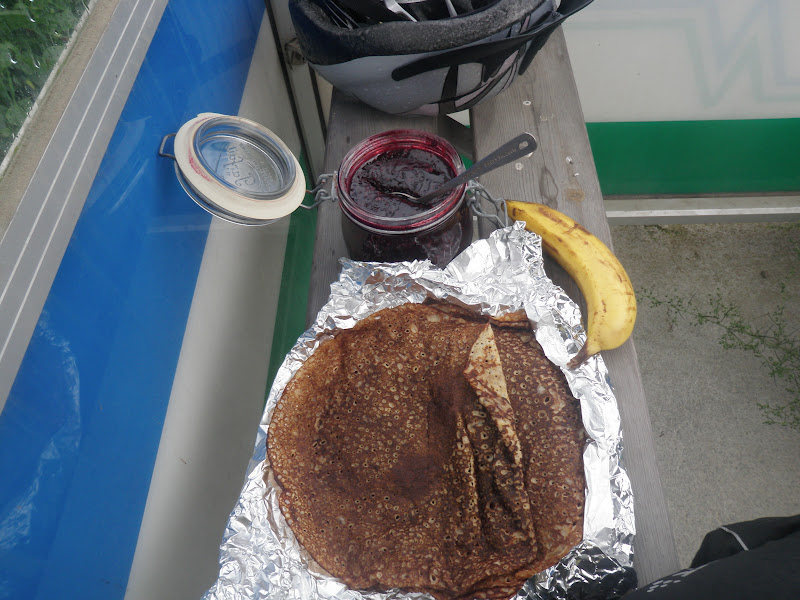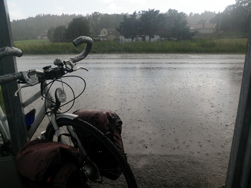 Vi hann inte så mycket mer än lämna Dagsås så stannade vi i en busskur då det kom en rejäl skur. De där 8 kilometerna tog för övrigt sin lilla tid då vinden var emot oss. Men hursomhelst så passade vi på att äta upp pannkakorna med den goda sylten när vi satt där och väntade på torrare väder.