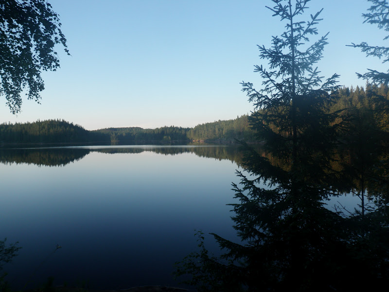 Det har varit väldigt kuperat större delen av dagen, bland annat skulle vi upp för en kilometer lång backe med 10 % lutning. Det var tungt. Jag var tvungen att leda cykeln hela vägen upp. Men väl på toppen väntade mååånga kilometer nedför. Först var det en massa skog jag skulle igenom, omöjligt att finna en bra lägerplats, men precis efter att jag kommit in i Römskog kommune gick vägen mellan två sjöar. Där hittade den perfekta lägerplatsen vid en av dem! Så efter att jag slagit upp tältet satt jag ute och rensade/tvättade kantarellerna jag plockade under förmiddagen samtidigt som jag tittade ut över sjön som inte hade en endaste krusning på sig, helt spegelblank med andra ord! Till middag blev det smörstekta kantareller och sparrisrisotto, mycket gott! 🙂