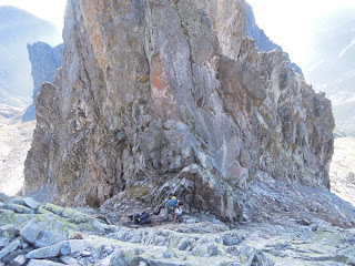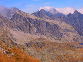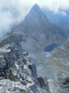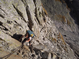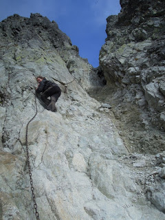 Så efter att gått ner 400 höjdmeter var det åter dags att gå upp, nu Prielom sadeln, 2288 möh. Sista höjdmetrarna dit var ganska svåra att gå då stenarna där var väldigt lösa. Därifrån gick vi sedan ner igen till Polsky hreben (Polska kammen) 2200 möh. Vägen ner var väldigt brant, vi fick ta kedjor och fastborrade järnsteg till hjälp.