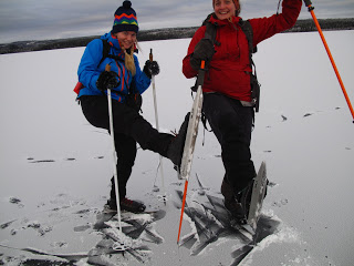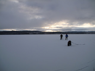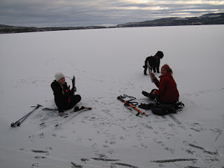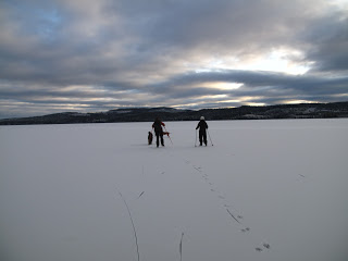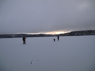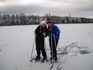 Den kanonfina dagen igår gav mersmak, därför var jag ute och åkte långfärdsskridskor även idag. Jag var ute med mina kusiner, Josefine och Victoria. Vi hade helt underbar is, under natten hade det snöat lite så isen täcktes av en tunn tunn hinna snö, så pass tuss att man inte märkte av den mer än att den färgade hela sjön vit. Isen på Helgesjön var betydligt tunnare än den som var på Ottsjön. Så efter att vi mött ett par, som också var ute och åkte, som berättade att det var en man som plurrat igår la vi till med en mer försiktig åkstil. För hamna i vattnet vill man ju helst undvika.
