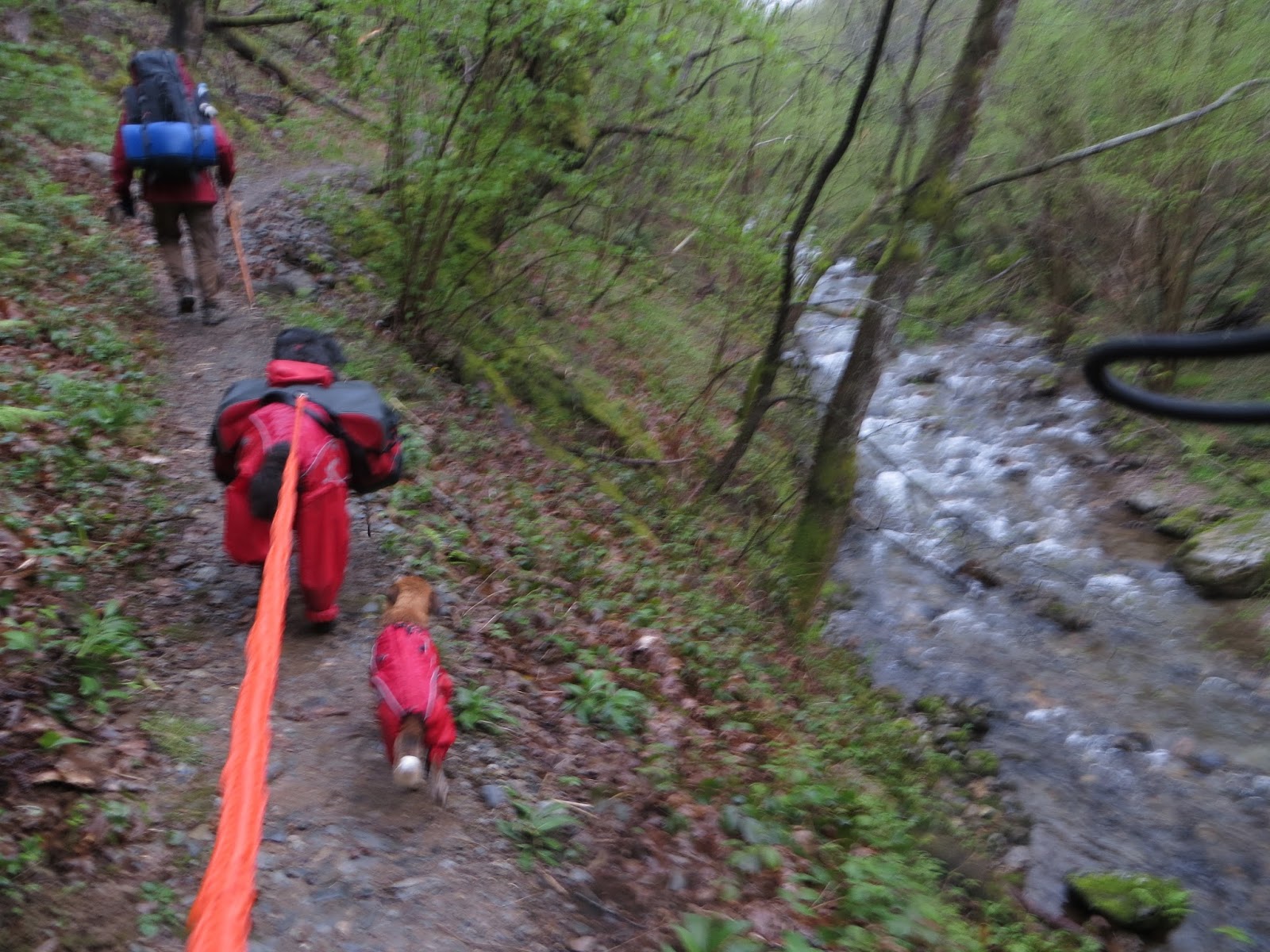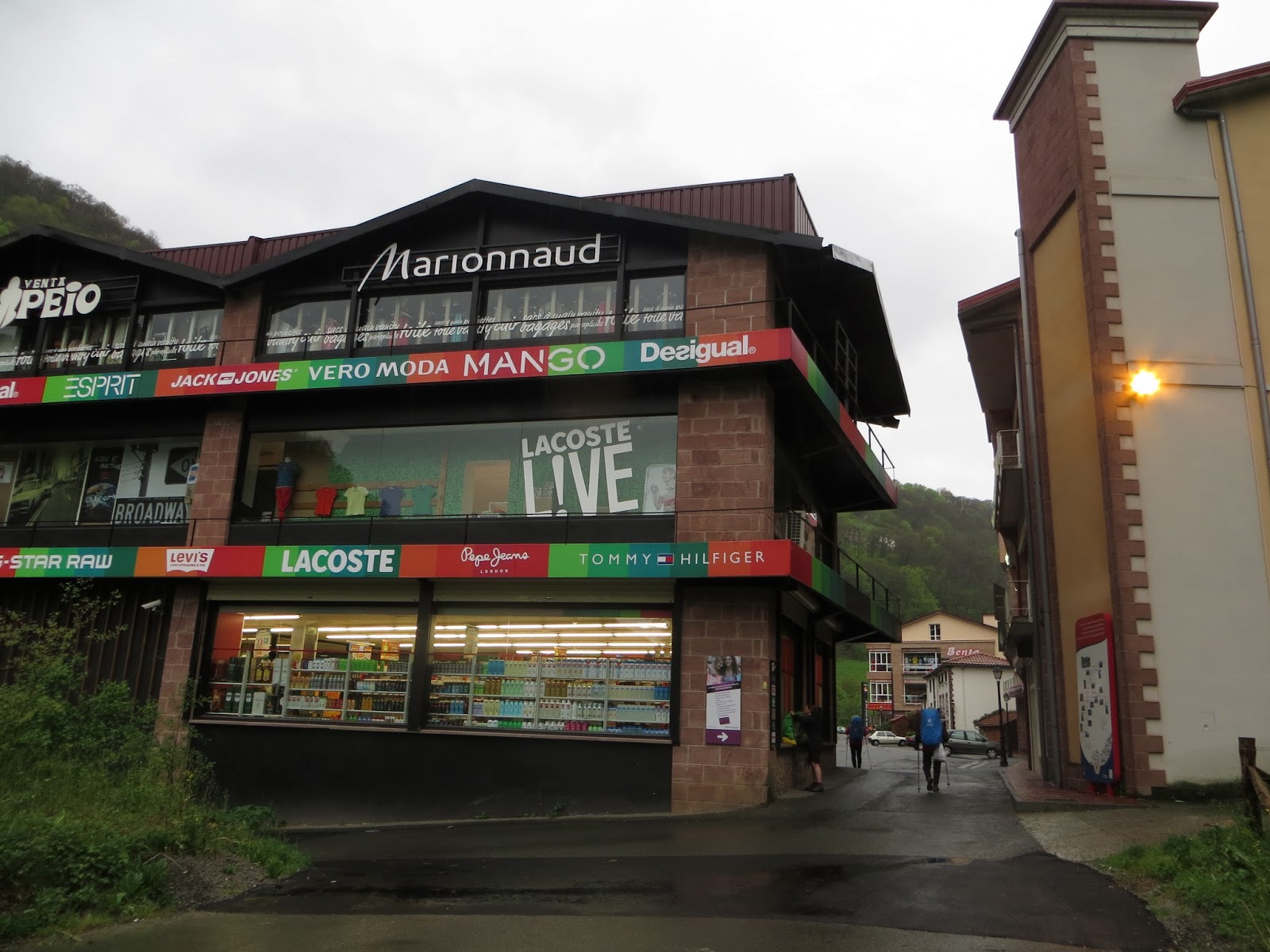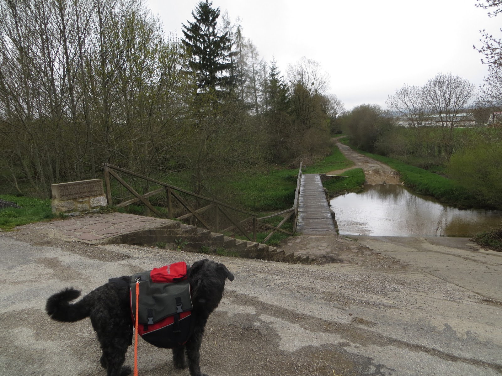 Jag följde Route Valcarlos, redan efter tre kilometer var det dags att pausa. Då var jag precis på den spanskfranska gränsen i den lilla köpstaden Ventas. Jag gick på djuraffären där och köpte, enligt hundarna, god kattmat (dem hade inte mjuk hundmat). Sen var det bara att sätta på hundarna sina regnkläder innan det var dags att vandra vidare. Det tog några hundra meter innan Yoda insåg att man faktiskt kan gå i den.