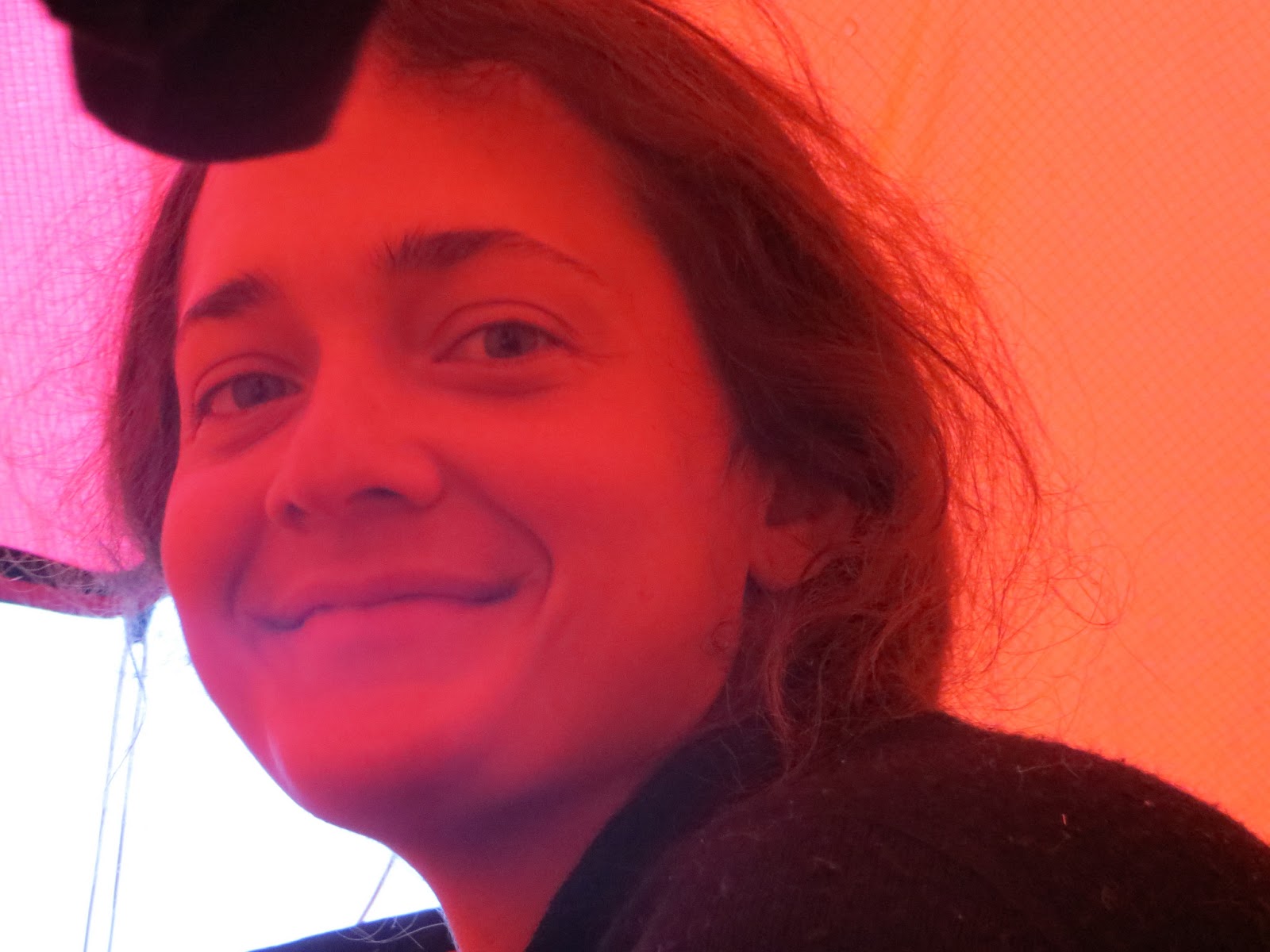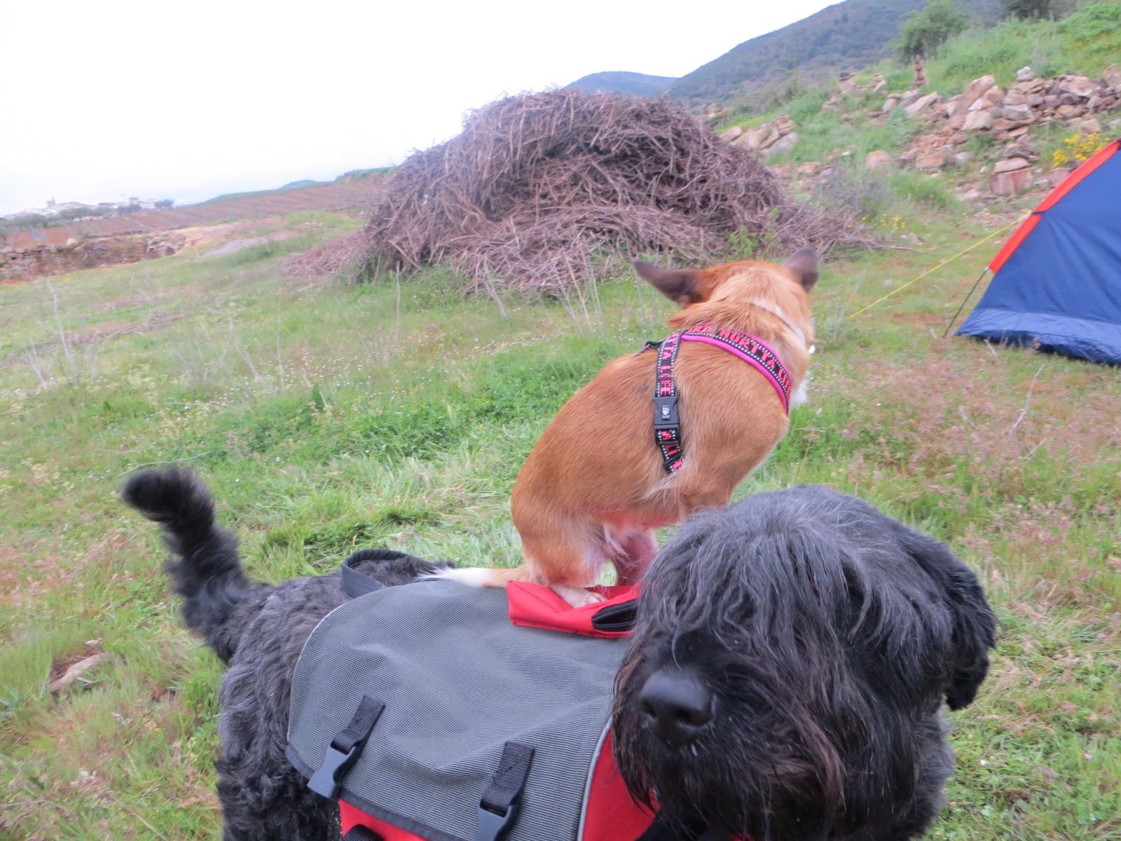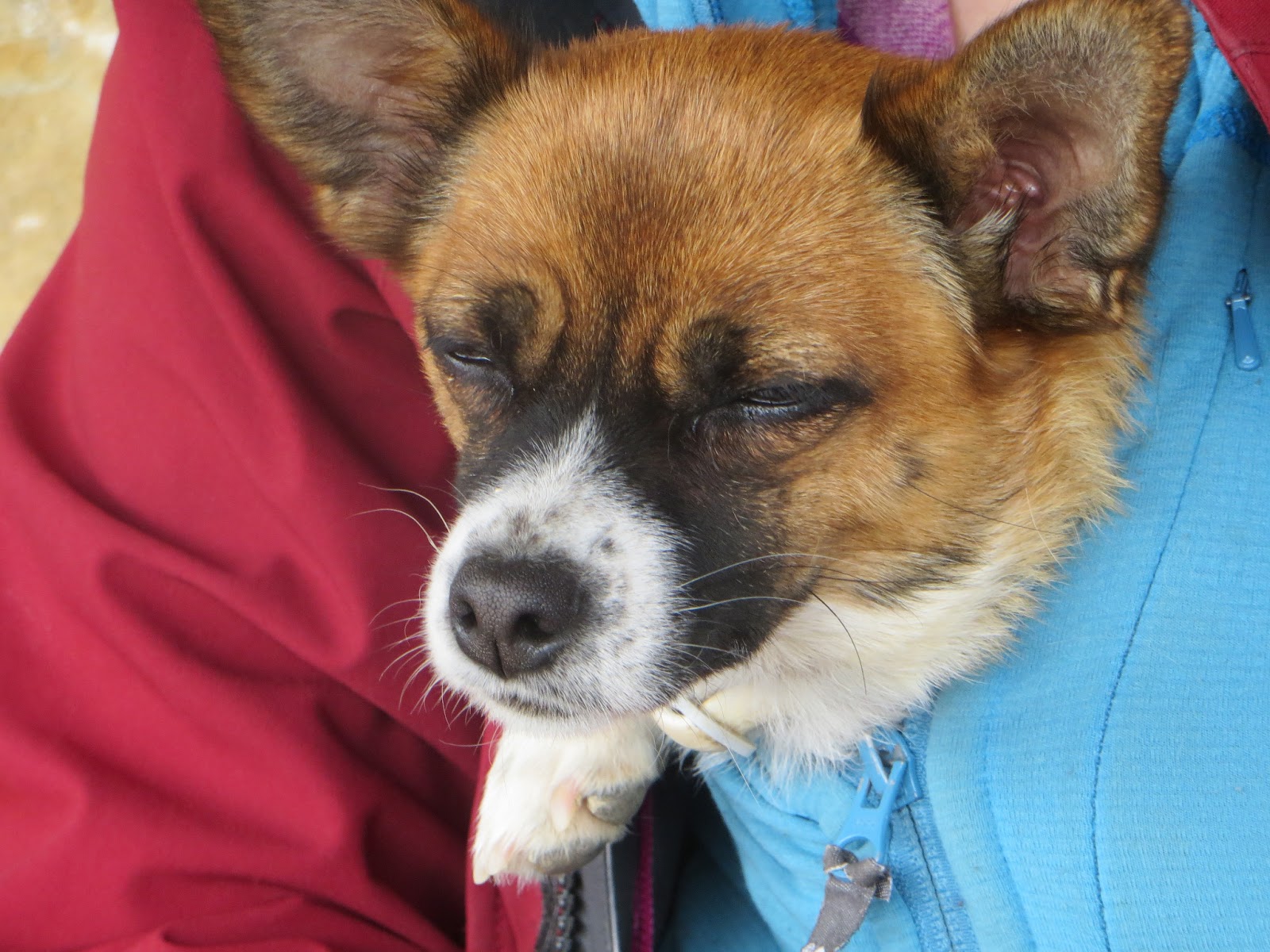 Solen fick jag se för första gången idag, under några timmar på eftermiddagen hade den bestämt sig för att komma fram ur molnen, äntligen. Började så smått vara leds på allt regnande. Hundarna med. Utan deras regnoveraller hade det inte varit särskilt roligt. Speciellt inte för Yoda som blir kall så lätt. Vid alla pauser fram till denna eftermiddag har hon krupit ner under min tröja eller jacka för att få värme. Idag när solen sken nöjde hon sig med mitt knä 🙂 Vega är jätteduktig med sin väska, idag har hon ändå för fått bära lite mindre för att få lite vila eller vad man ska säga.