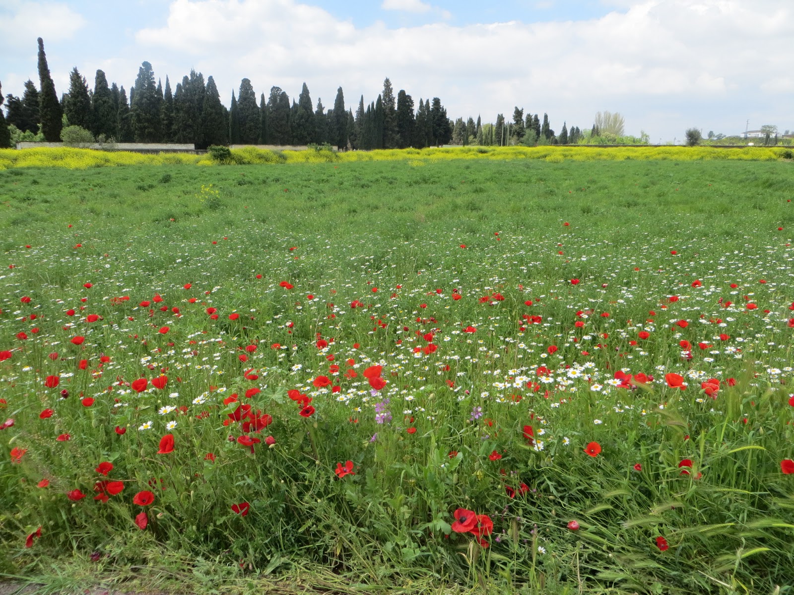 Jag har vandrat igenom små samhällen (som alla ligger på höjder) och genom vin-, oliv-, och mandelodlingar. Jobbigaste sträckan hittills har tillryggalagts, den var inte jobbig rent fysiskt (eller det var den också..) Men 12 km genom fält och inte så mycket som ett hus passeras gör att man får känslan av att man går och går utan att komma framåt. Hela dagens etapp har varit längs stenhårda jordvägar. Det klagar mina fotleder över. Men det har varit vackert! Gillar verkligen rapsfälten med vallmoblomster i. När man sedan får se olika rovfåglar segla över dem (på nära håll) kan man inte annat än fascineras över naturen. De snöklädda bergstopparna i fjärran gör inte det hela sämre.