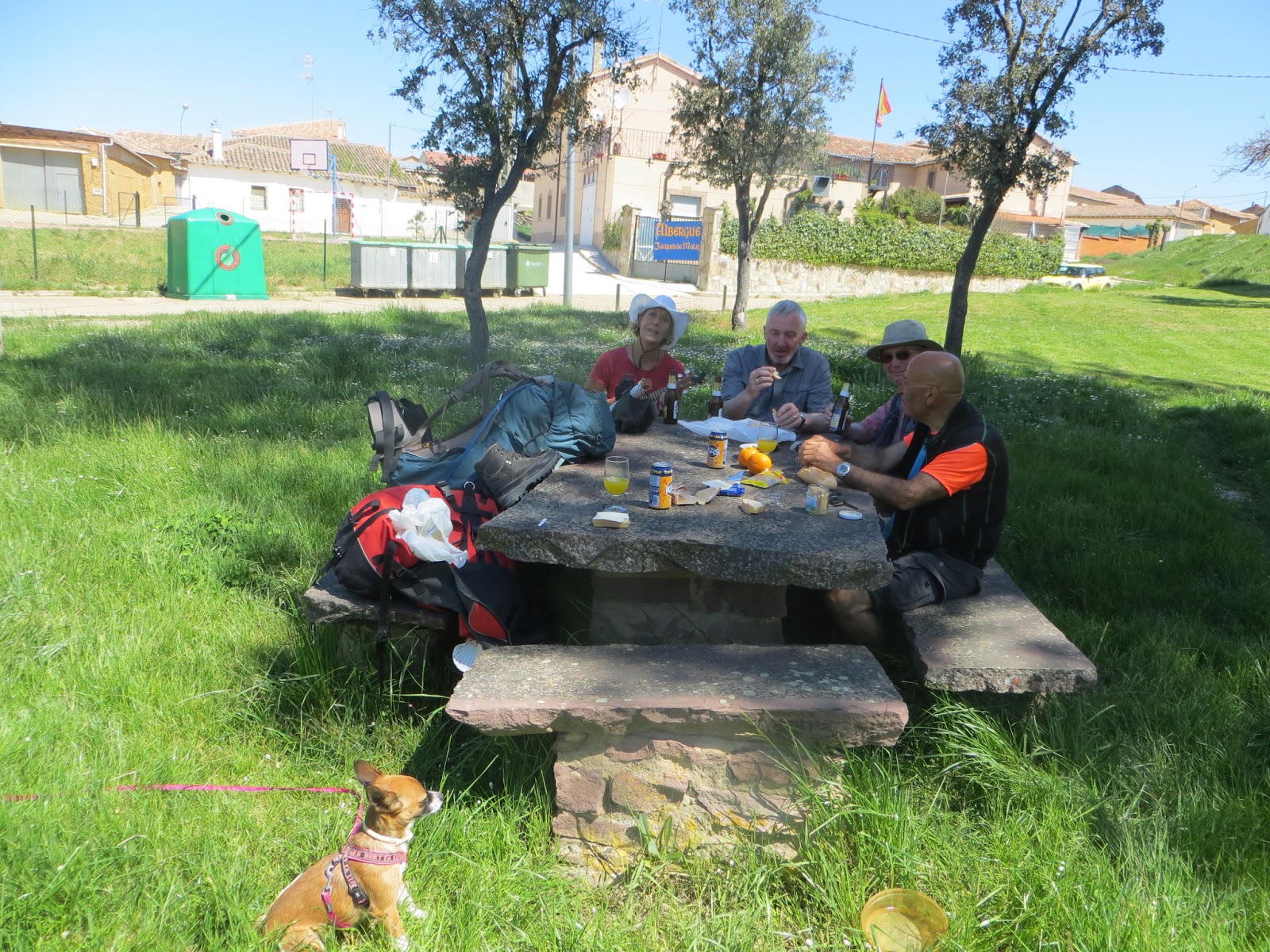 Jag och hundarna sov på en camping i natt. Jag kunde (tyvärr) inte göra rätt för mig då jag anlände efter att receptionen stängt och började gå i morse innan de öppnat. Richard kom och mötte upp på campingen så började vi gå tillsammans. Vi gick först till Calzada del Coto, där köpte vi bröd, oliver, ost, yoghurt, bananer, äpplen och plommonsylt. Sen vandrade vi ut ur det lilla samhället till några bänkar där vi minst sagt avnjöt vår frukost. Richard har precis som tidigare dagar berättat historier från sitt liv, medan han berättar kan jag inte annat än tänka på boken ”hundraåringen som klättrade ut genom fönstret och försvann”, enda skillnaden är att Richard inte är 100 utan 71 år och det han berättar är har hänt på riktigt.