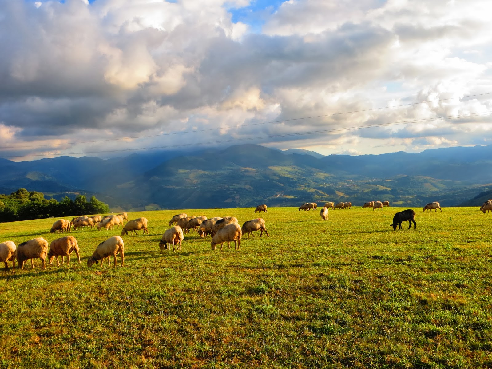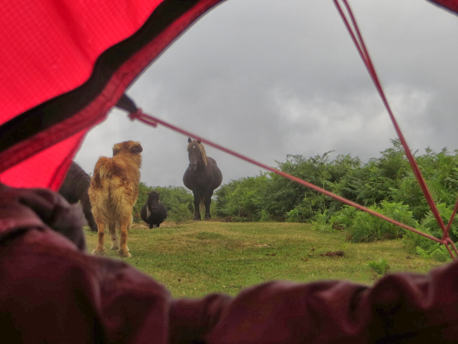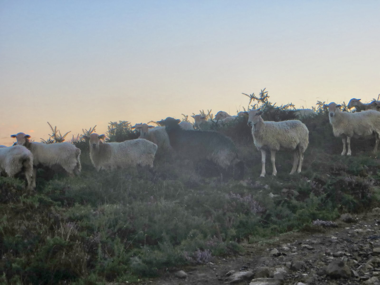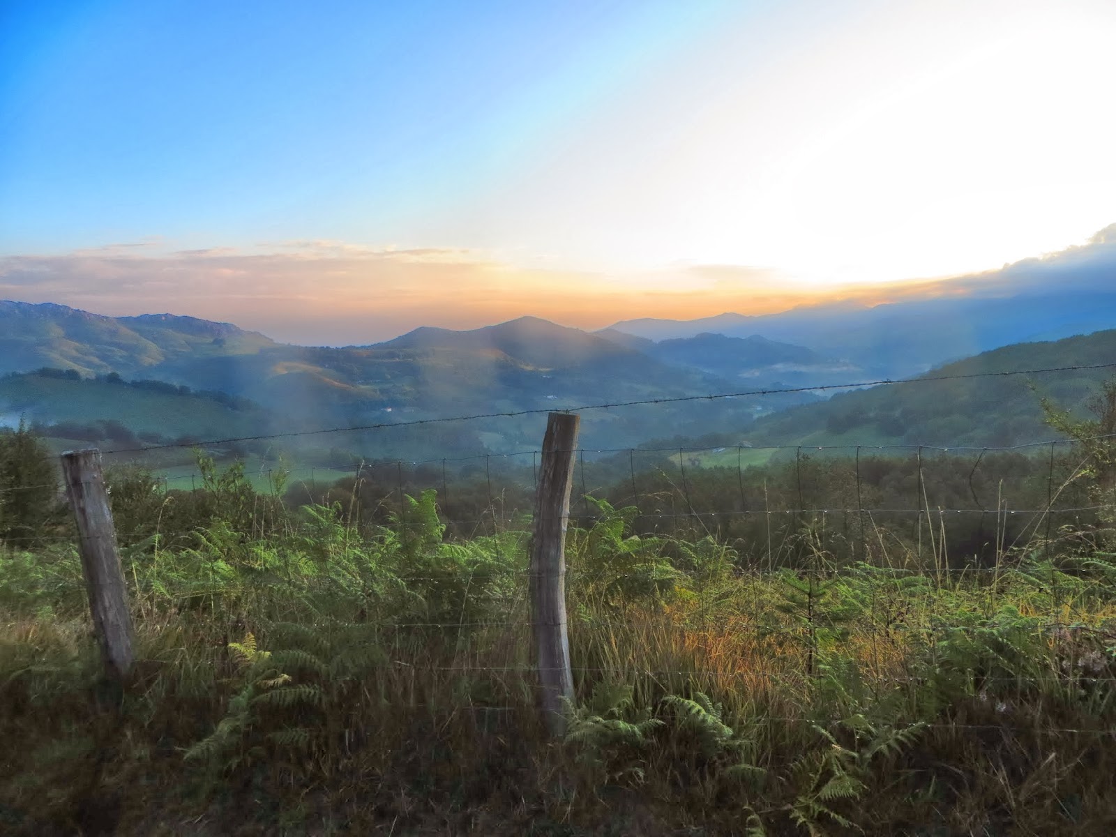 2 km från Larrun har jag slagit upp tältet. Jag har ett 360 graders panorama med olika bergstoppar. Jag hör bjällror, vilket betyder att det antingen är får eller hästar i närheten (dessa vildhästar ser inte så vilda ut då de alla har bjällror runt sina halsar). Det är mysigt när man går, hör ljudet av en bjällra, kollar upp och ser ett par stora ögon tillhörande en häst kollar tillbaka på en.