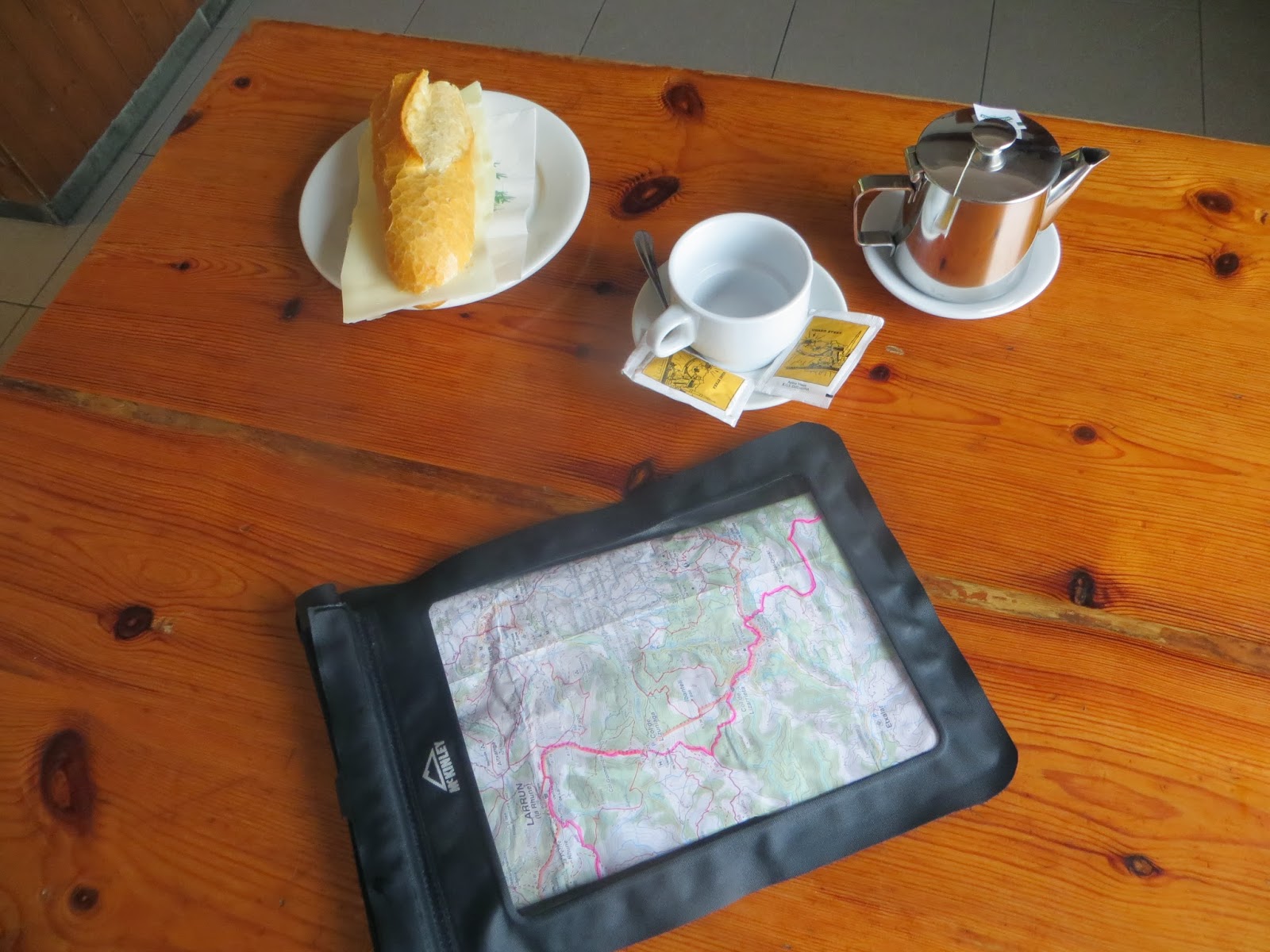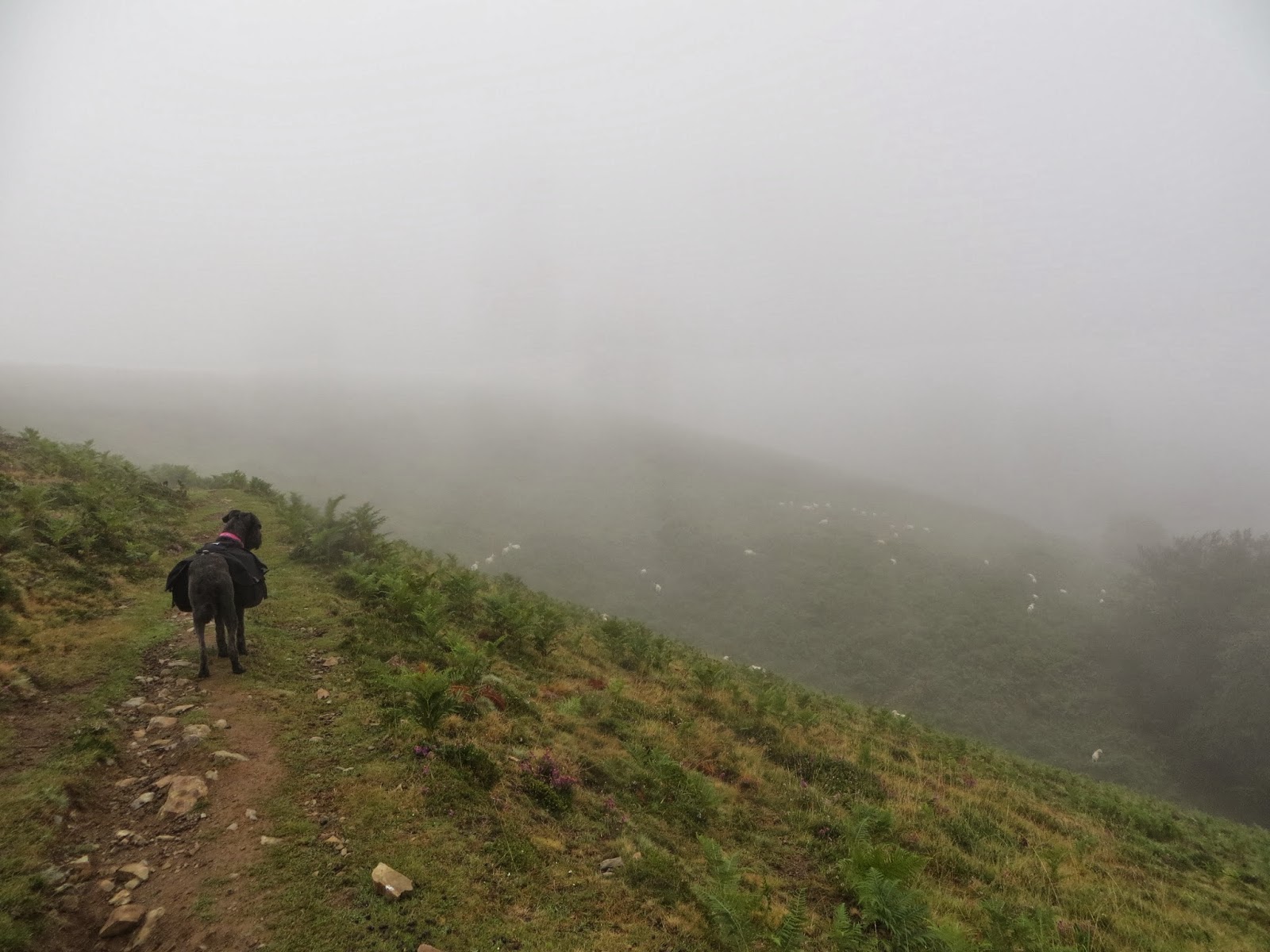 Jag började dagen med att gå uppför, mycket uppför. Eller 600 höjdmeter till Larruns topp (906 möh). Kändes som ännu mer 😉 Som lön för mödan fick vi förutom att känna oss nöjda fika. Där på toppen finns nämligen en restaurang. En kopp te och en ostsmörgås till mig och skinka till Vega . Måste säga att det var en väldigt bra restaurang, kanske mest för det faktum att dem tillät hundar där inne. Vad vi däremot inte fick något av var utsikt då dimman låg tät. När vi sedan skulle gå ner, var jag tvungen att gå väldigt långsamt. Gårdagens regn gjorde stigarna leriga och hala. Den sträckan var inte markerad, vilket gjorde att även orienteringen tog lite längre tid.