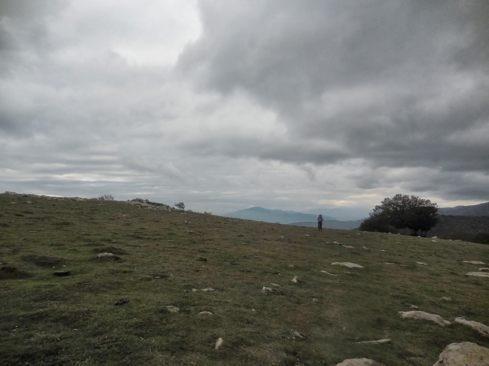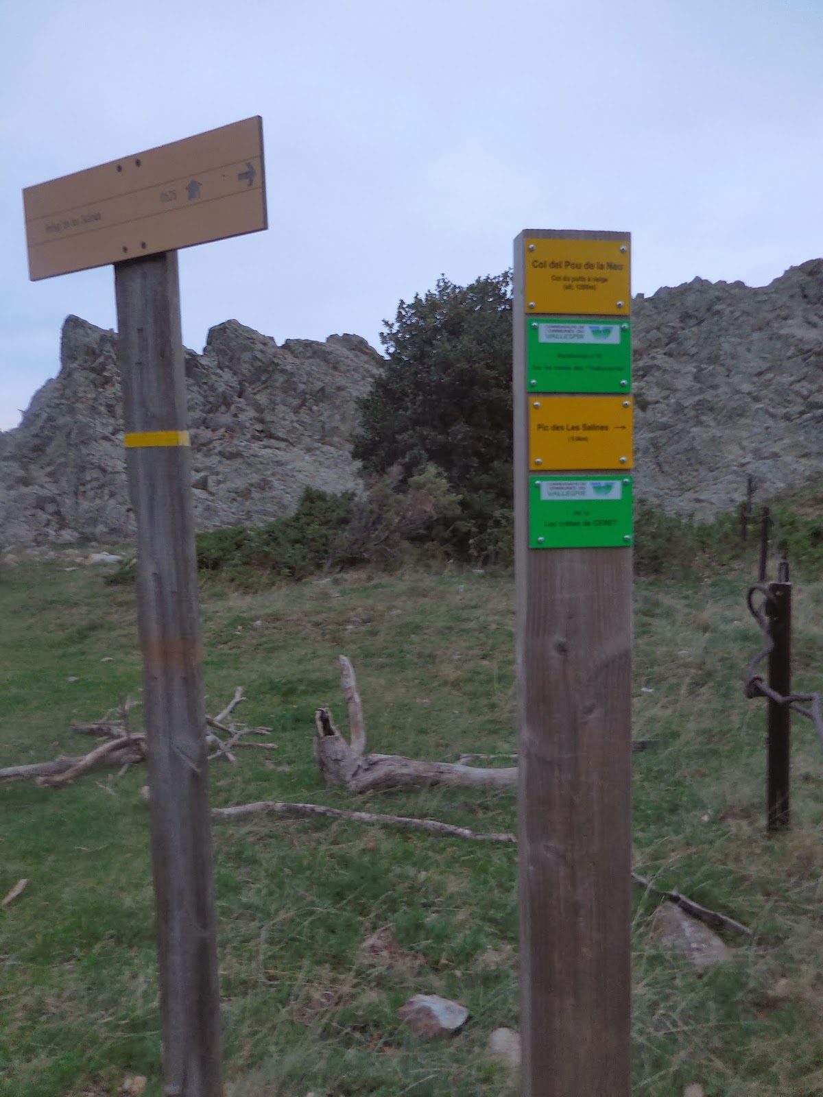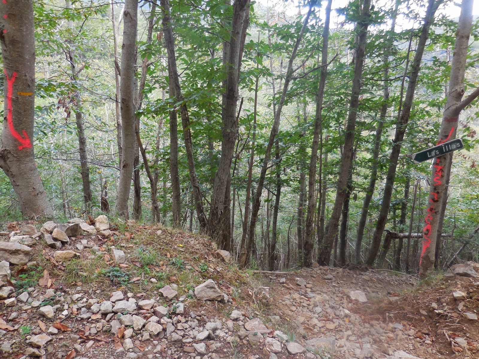 Lite efter det blev jag minst sagt skiträdd. Jag gick rakt in i 7 st bökande vildsvin! Jag skrek rätt ut på ett sådant sätt som de aldrig verkar ha sett eller hört tidigare. För aldrig har jag sett en gris springa så snabbt som dessa gjorde. Mitt skrik chockade inte bara dessa grisar, det chockade även Vega som efter det gick som ett ljus bakom mig. Efter det jag jag och ropade lite nu och då för att inte gå in i fler svin. Jag har gått genom skog hela dagen, skönt då solen värmt väldigt mycket. Solen är som bäst i skuggan när man vandrar. När jag var uppe vid Roc de Frausa, 1450 möh, som jag valde att inte gå upp till då det börjat att skymma, (Dagens vilsegång tog låååång tid, att irra omkring är allt annat än tidseffekt) tog jag och följde GR10 ca 2 km till Coll dels Pous, 1239 möh istället. Längs den sträckan fanns varningar för vildsvin på flera ställen, för att ta mig därifrån så snabbt som möjligt joggade jag istället för att gå den.