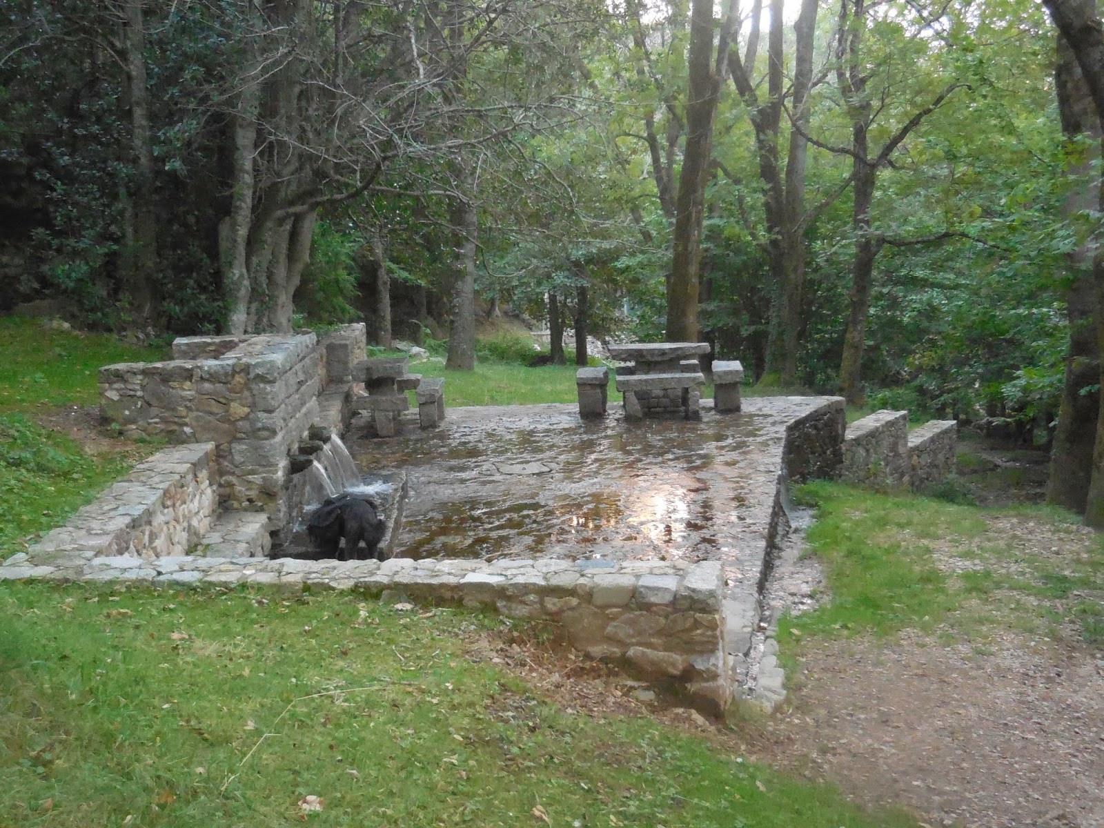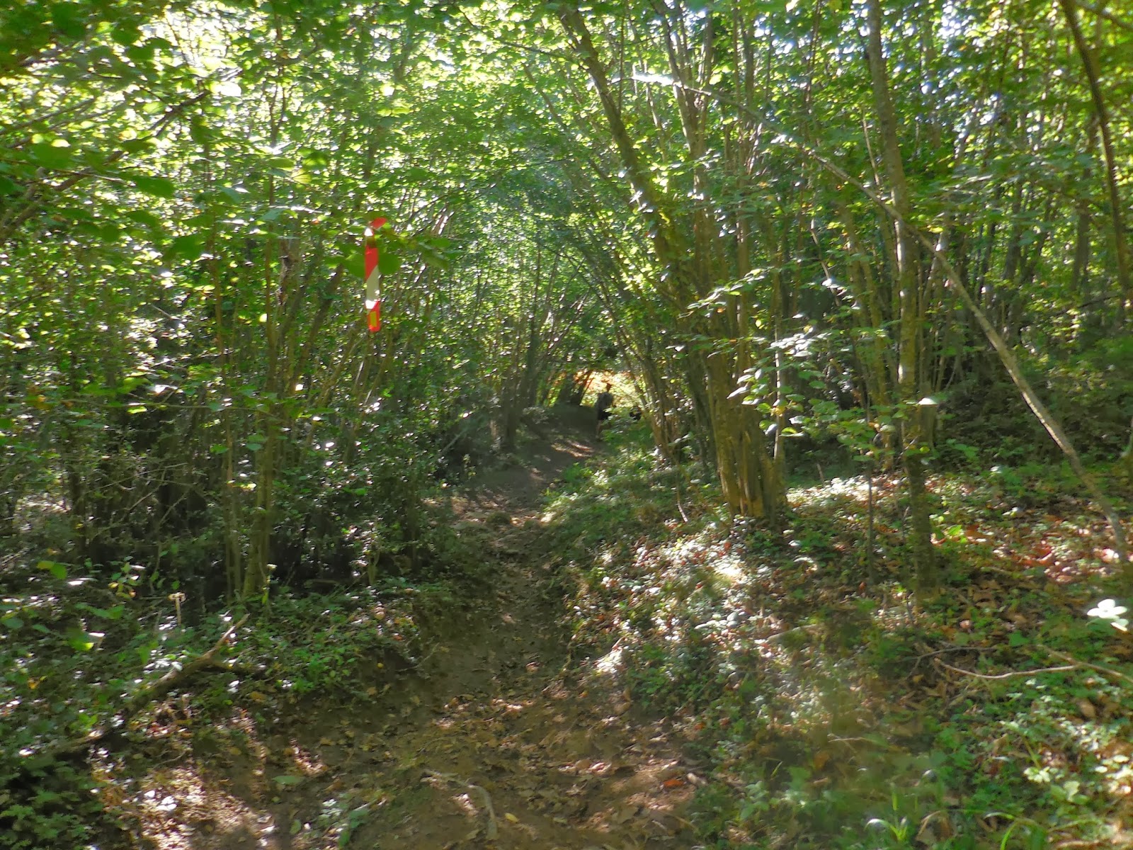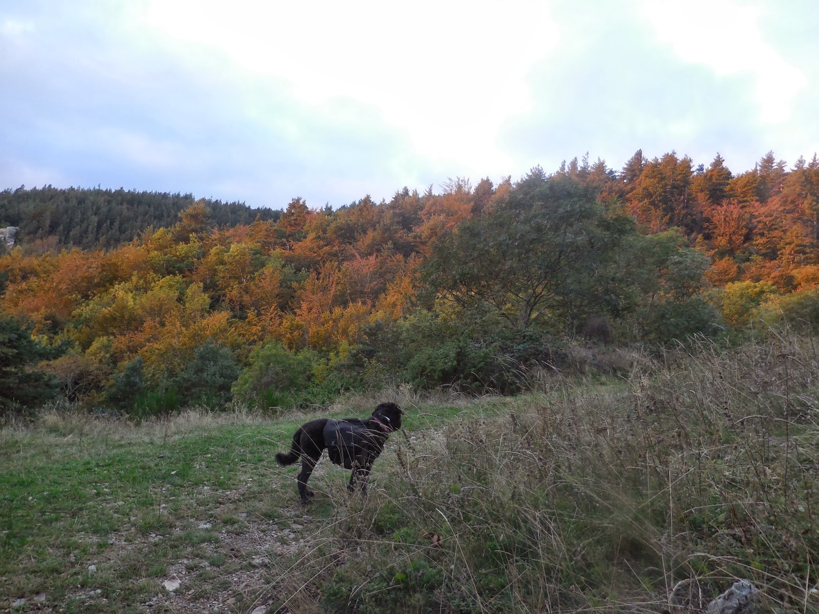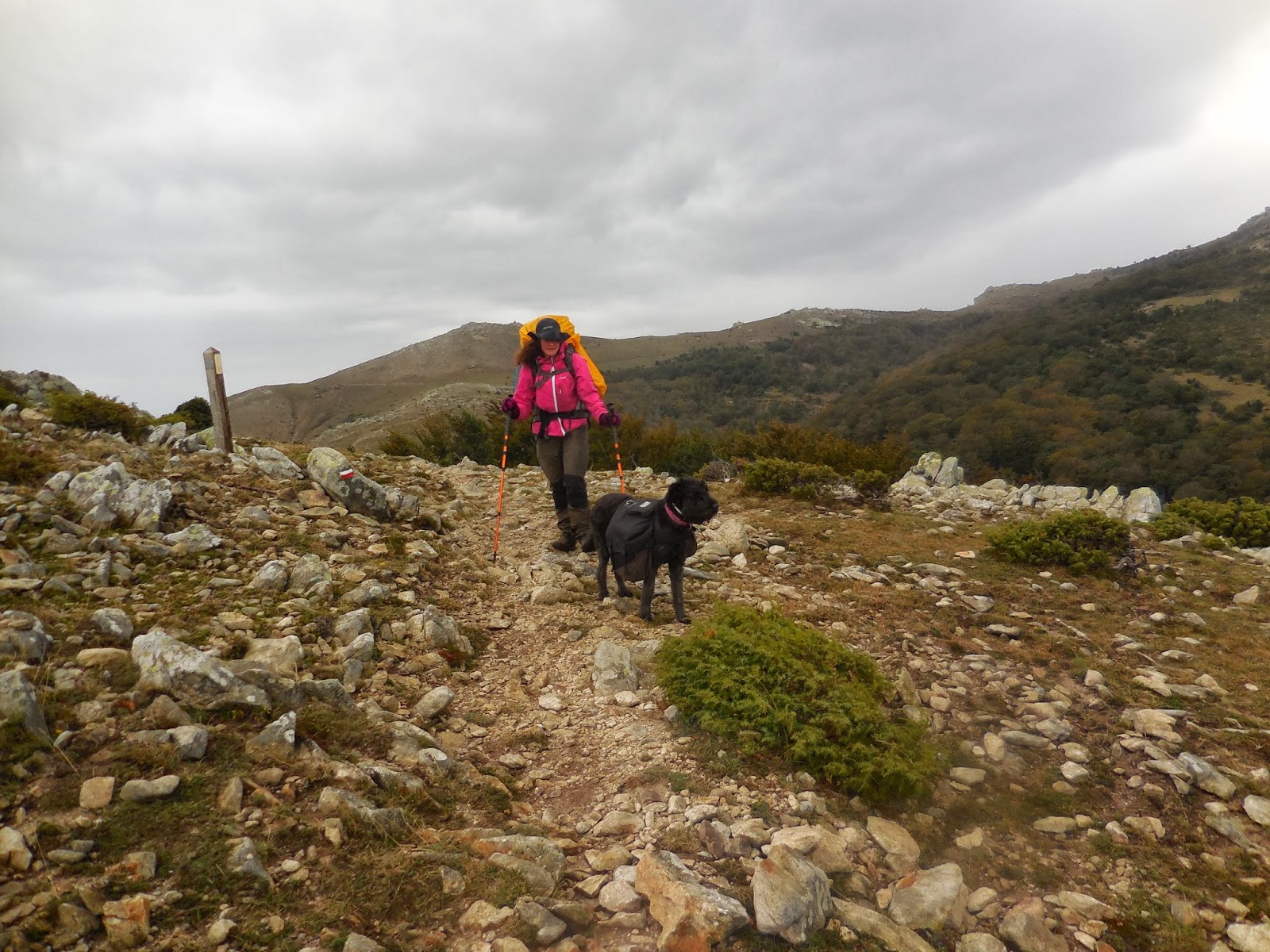 Lite efter det blev jag minst sagt skiträdd. Jag gick rakt in i 7 st bökande vildsvin! Jag skrek rätt ut på ett sådant sätt som de aldrig verkar ha sett eller hört tidigare. För aldrig har jag sett en gris springa så snabbt som dessa gjorde. Mitt skrik chockade inte bara dessa grisar, det chockade även Vega som efter det gick som ett ljus bakom mig. Efter det jag jag och ropade lite nu och då för att inte gå in i fler svin. Jag har gått genom skog hela dagen, skönt då solen värmt väldigt mycket. Solen är som bäst i skuggan när man vandrar. När jag var uppe vid Roc de Frausa, 1450 möh, som jag valde att inte gå upp till då det börjat att skymma, (Dagens vilsegång tog låååång tid, att irra omkring är allt annat än tidseffekt) tog jag och följde GR10 ca 2 km till Coll dels Pous, 1239 möh istället. Längs den sträckan fanns varningar för vildsvin på flera ställen, för att ta mig därifrån så snabbt som möjligt joggade jag istället för att gå den.