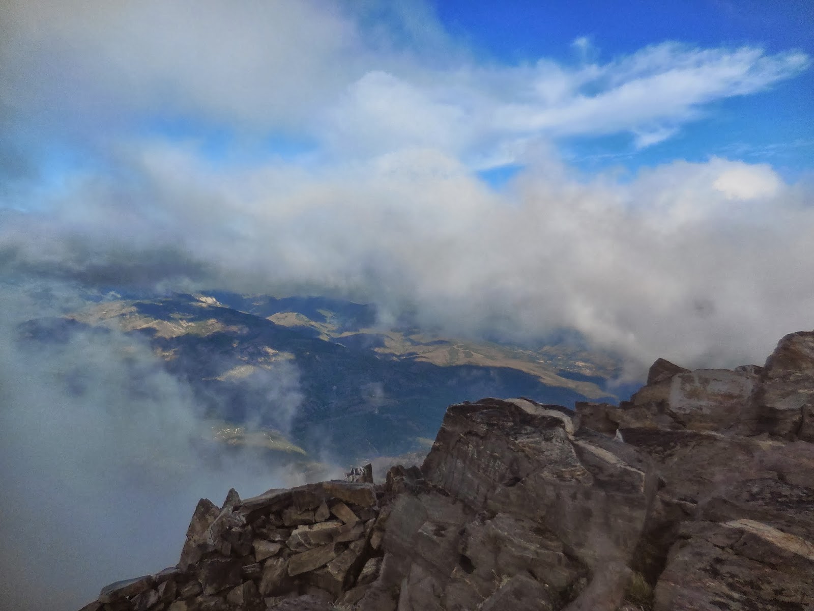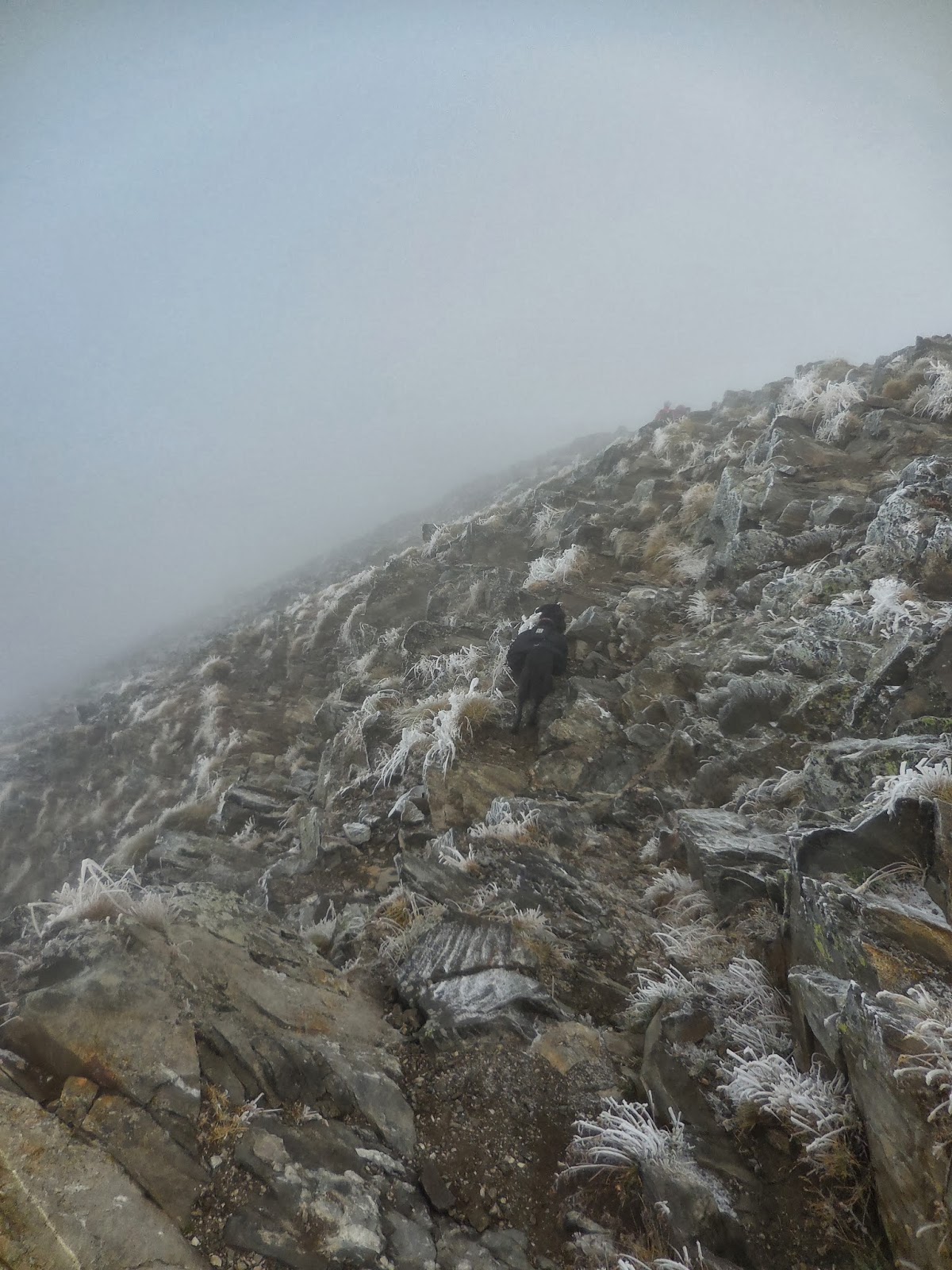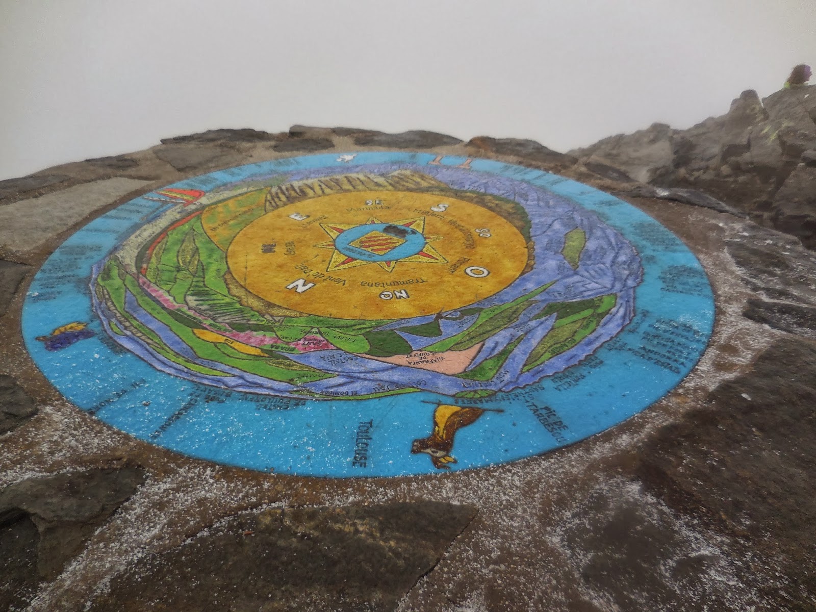 Klart kallaste natten! Vaknade flera gånger pga att jag frös och när jag kollade ut en av gångerna föll ett lätt snöfall. Dimman låg tät när vi startade gå upp mot Canigou, 2784 möh. 484 höjdmeter hade vi kvar till toppen. Endast de sista 100 av dem branta och rätt så svåra. Vega imponerade alla som var där. Att denna topp var populär hade jag läst. Men att den skulle vara fullt så populär som det visade sig att den var, var jag inte beredd på. Redan 9.30 när jag nådde den var där redan många på plats. Människor bokstavligen vallfärdade till den. Hela tiden fylldes det på med nya vandrare i alla åldrar. (Den vanligaste stigen upp till den går från motsatt håll som jag kom från).