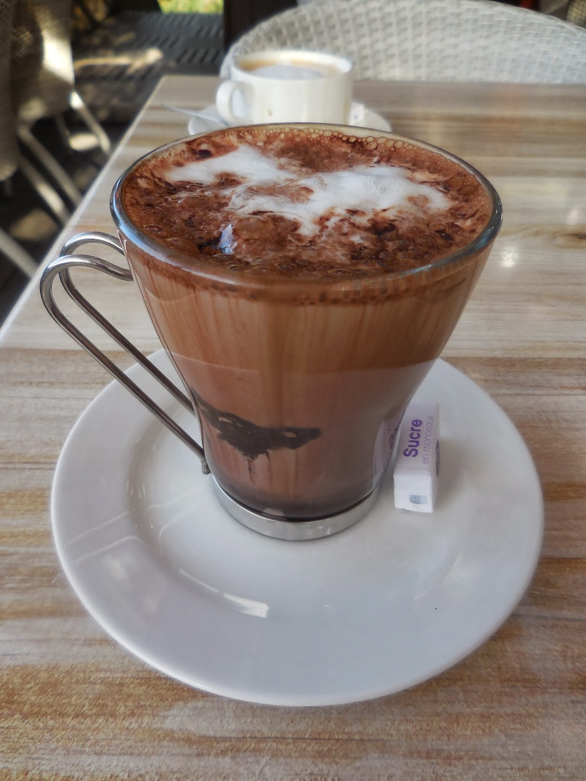 Väl nere vid refuget var det som att gå från vinter, det var lite snö på toppen, korset som står där var täckt med is och vindarna isande kalla, till en varm sommardag. Jag gick in åt en crêpe och drack en kopp varm choklad samt diskuterade vägval med en av dem som jobbade där innan jag gick vidare.