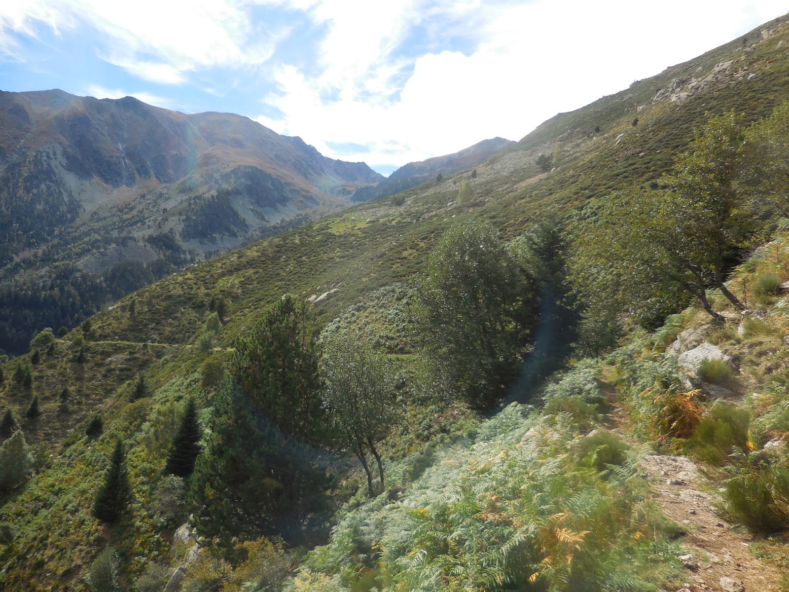 Därifrån är vandringen jättevacker, den går längs en helt underbar stig. Och den blir bara bättre och bättre. Det var vackert med magisk utsikt helt ner till Col de la Cirère. På vägen ner vid l’Estanyol, 1479 möh mötte jag en ryss, Andrej. Vi gick 6 km tillsammans därifrån till lite efter Batère. Han går också HRP, men med lite annan fart och förutsättningar än jag. Mao är han betydligt snabbare. Han har hållet på 10 dagar mindre än jag. Det var tur att jag mötte honom för jag var verkligen trött just där och då. Sådana gånger underlättar det att ha sällskap. Andrej kör på att vandra så lätt som möjligt. Han har därför gjort och eller modifierat sin utrustning själv. Bla har han sytt sitt tält och sin sovsäck själv.