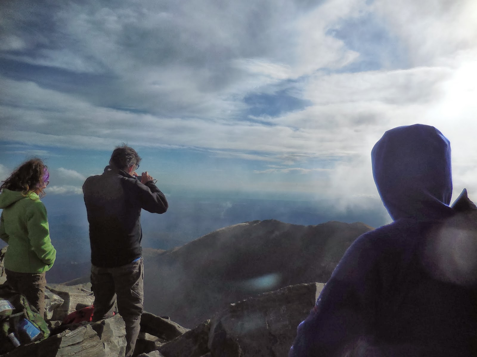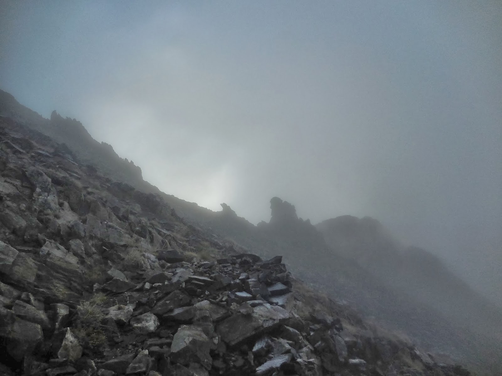 Ingen utsikt från toppen, förutom under några sekunder då dimman tillfälligt lättade just som vi var på väg ned. Då fick vi se havet klart och tydligt! Inte heller såg det ut som om det var särskilt långt borta.
