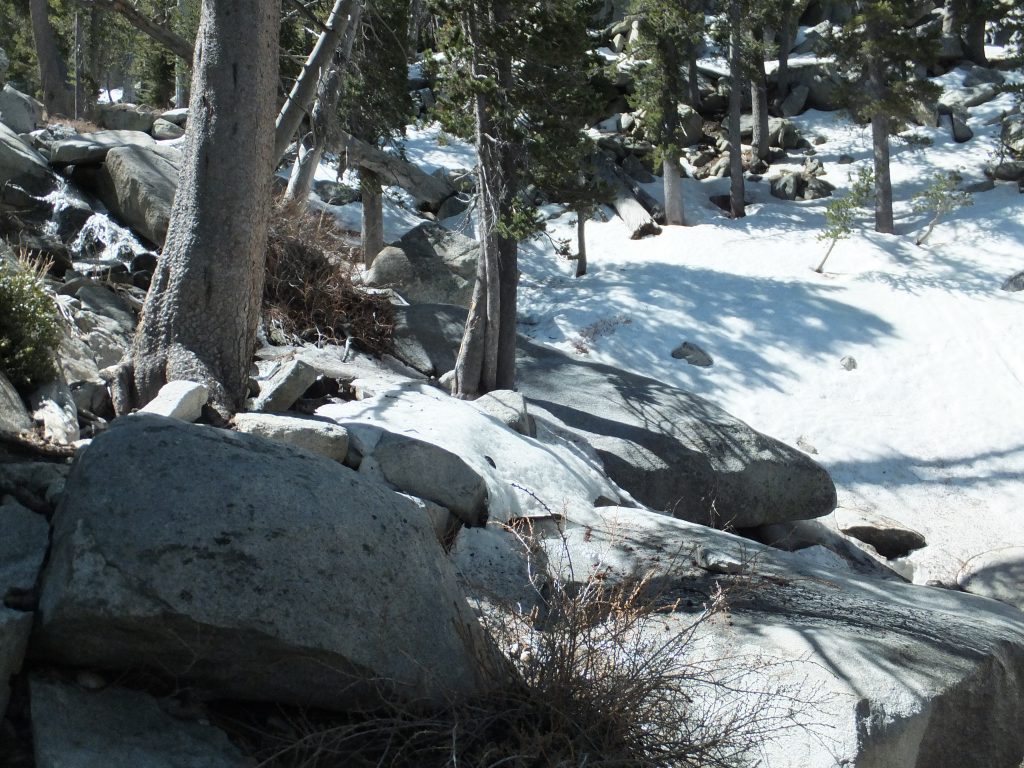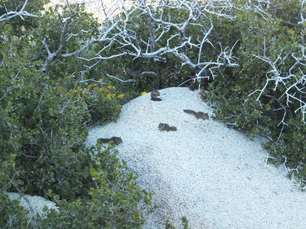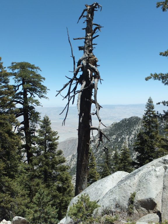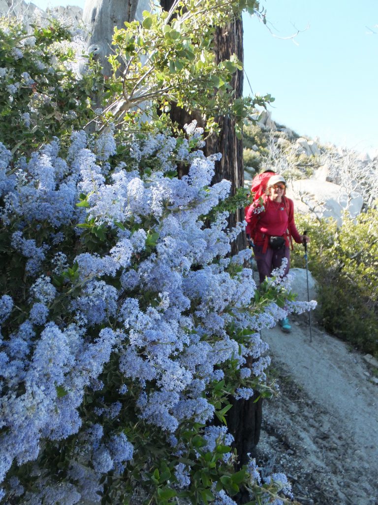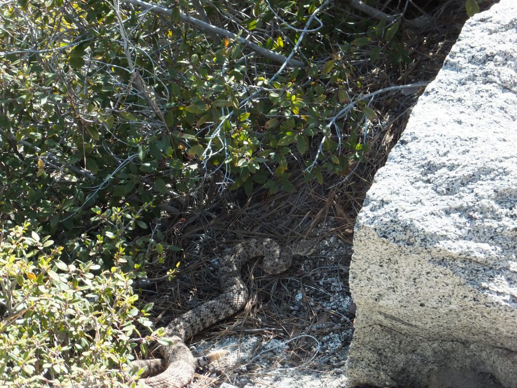 Vi gick aldrig upp på San Jacinto peak, (ca 3300 möh) utan fortsatte vår vandring nedåt mot låglandet istället. Vi gjorde en stor tabbe med att inte ta mer vatten från den sista bäcken vi passerade på högre höjd. Vi hade förlitat oss på en bäck längre ner som det enligt vår guidebok skulle finnas vatten i, men den var helt snustorr. Ju längre ner vi kommer desto varmare blir det och det börjar kännas kritiskt med den lilla vattenmängden vi har och vi blir allt mer törstiga. Vi känner av vattennöd för första gången. Som tur var får vi totalt 3 liter vatten från andra vandrare som vi snålar på resten av vägen då platsen vi tältade på är 15 km från närmaste vatten. En sträcka som är känd för att kunna bli riktigt varm.