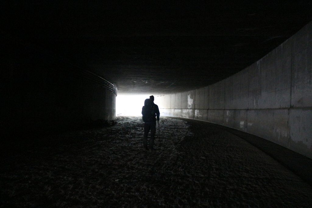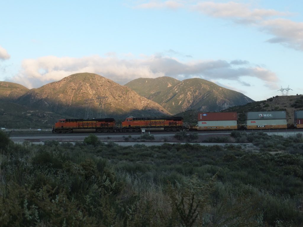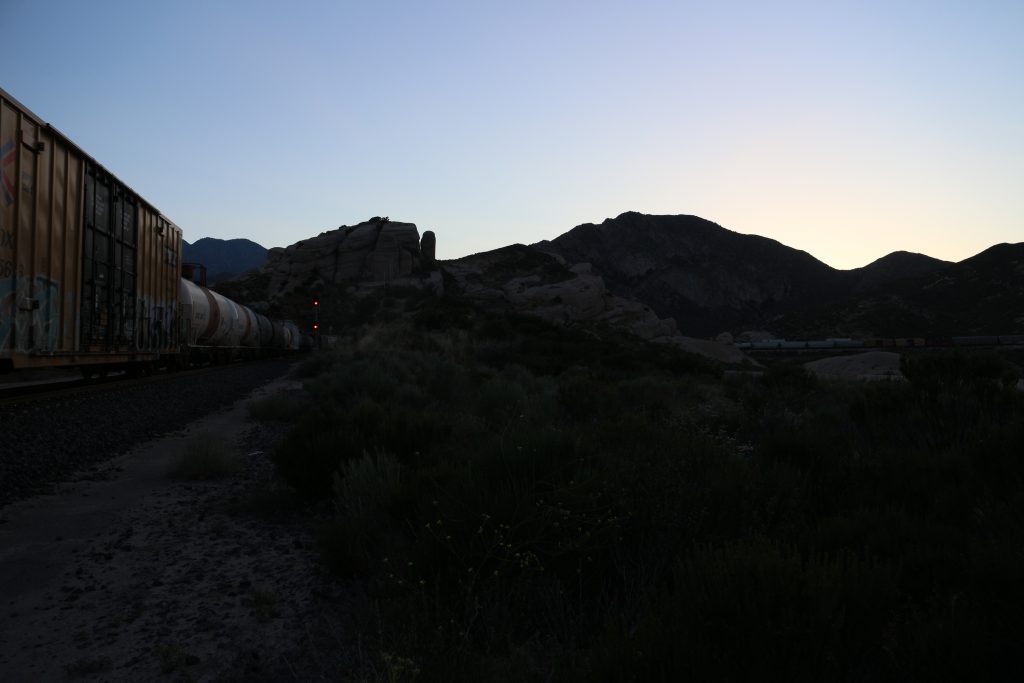 Vi lämnar Mc Donalds och går genom en tunnel under den extremt vältrafikerade interstate 15. Flera järnvägsspår ska korsas efter det. Vid ett spår får vi vänta länge innan vi tar oss över, ett godståg med 4 draglok och 2 lok som puttar på ca 100 godsvagnar ska passera först. Dessa tåg avlöser varandra ett efter ett. Alla tutar så det är nära på aldrig tyst.