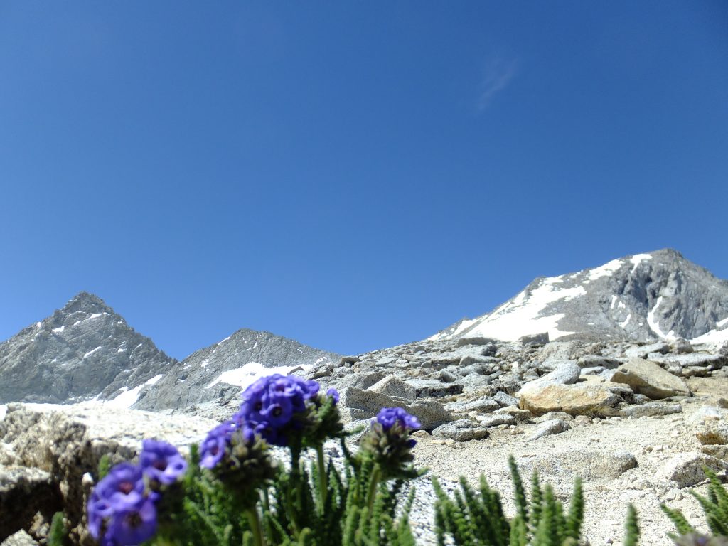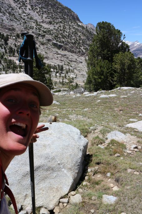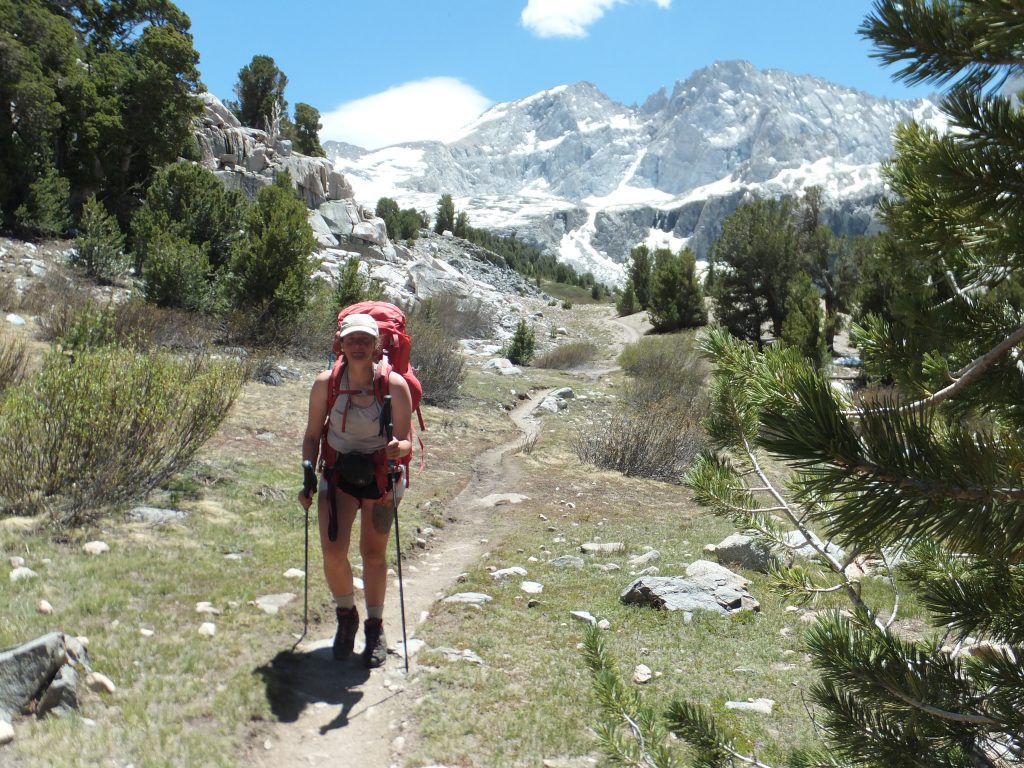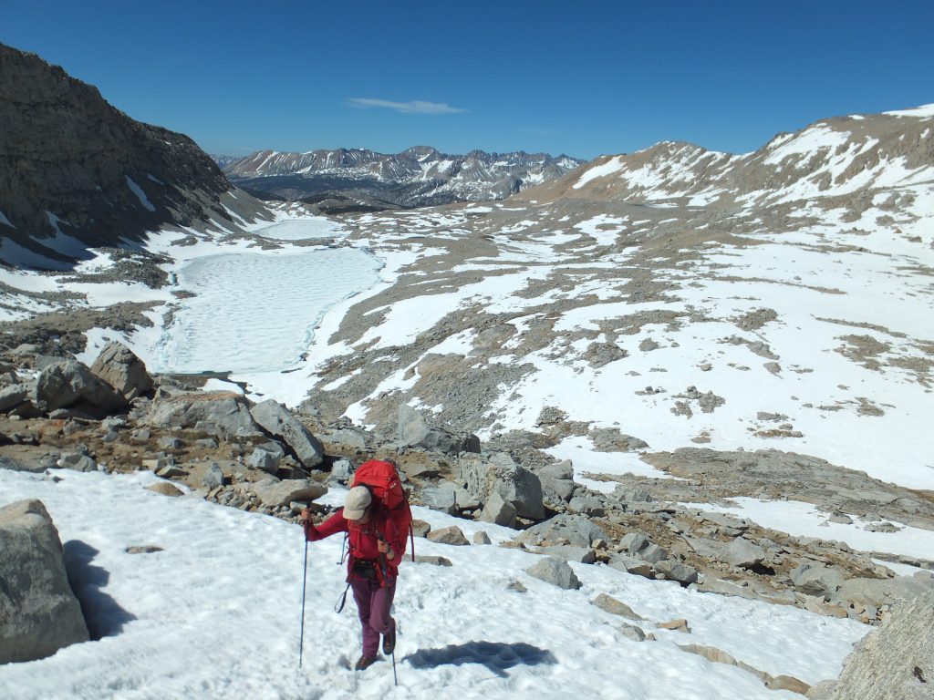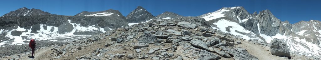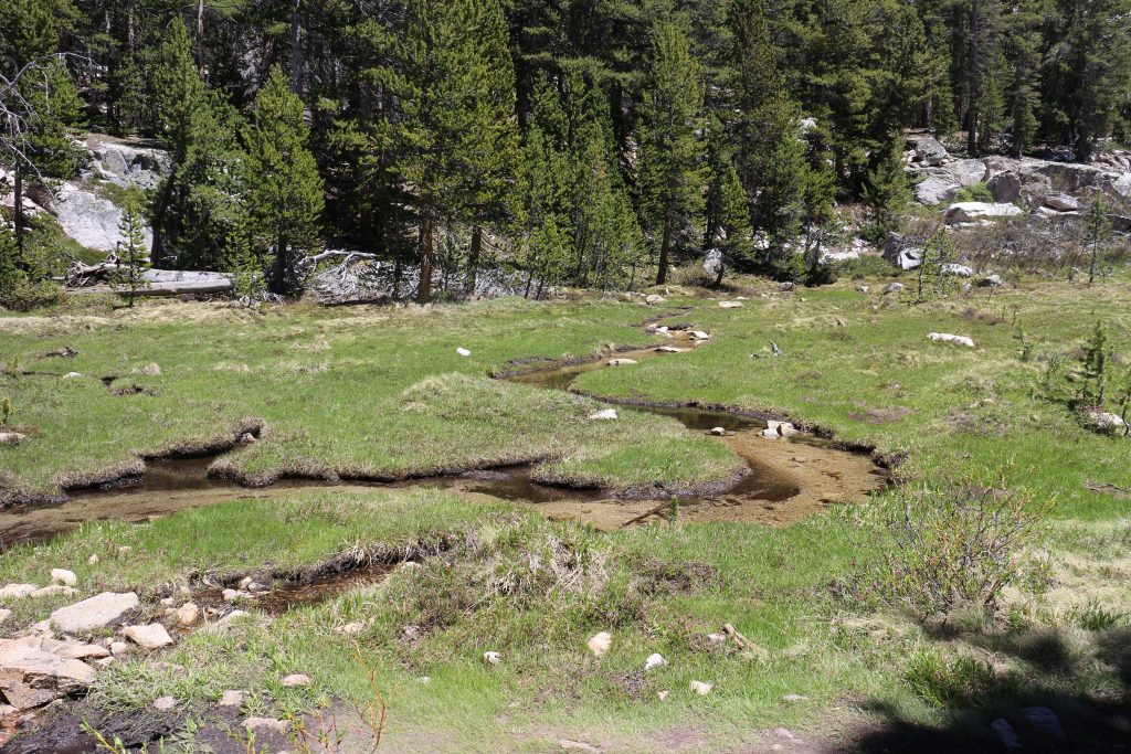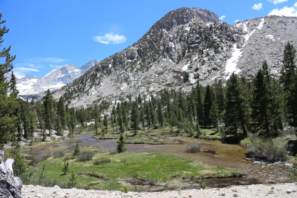 Vi lunchar vid vacker fjällbäck nedanför snögränsen. Vi följer senare Bubbs Creek, en bredare bäck/älv och korsar flera av dess tillflöden. Mycket vatten generellt sett i parken. Vi möter mycket folk. Den här delen av PCT ”delas” med John Muir Trail -en mycket populär led i high Sierras.