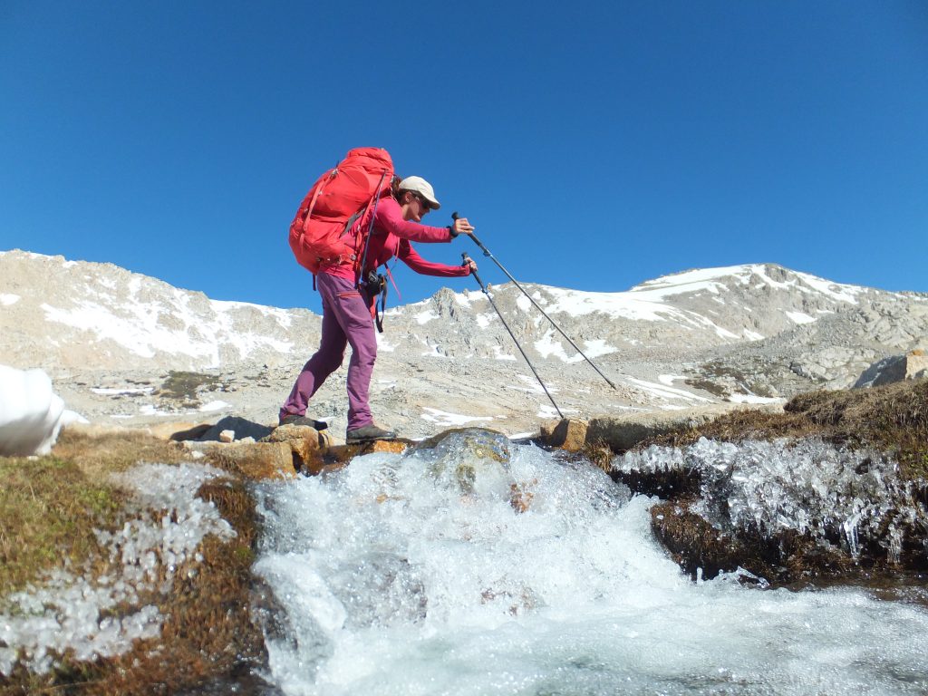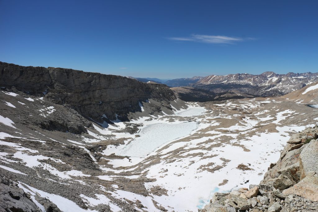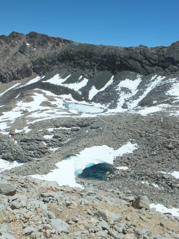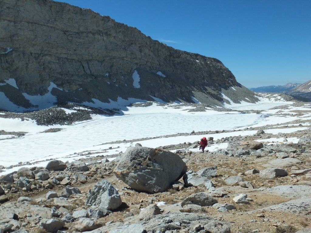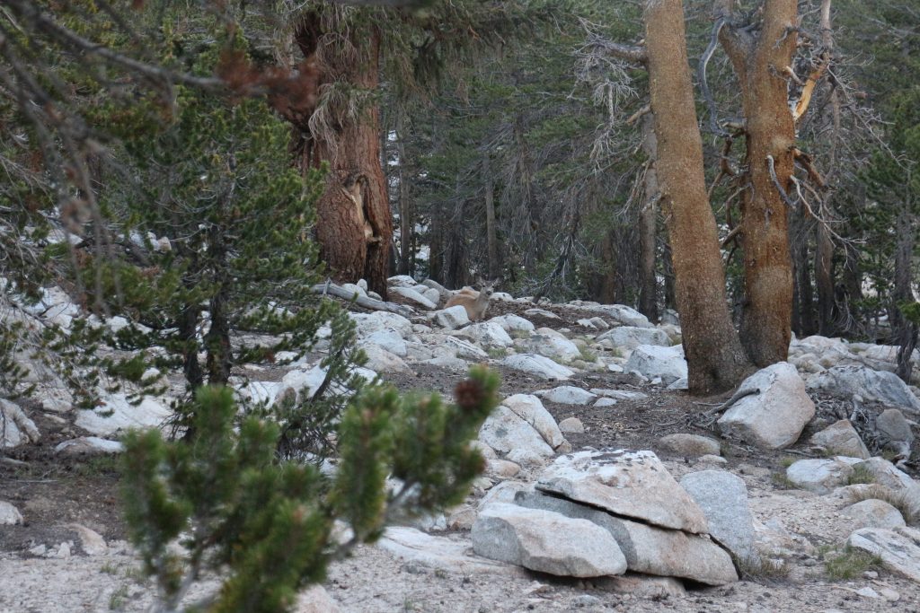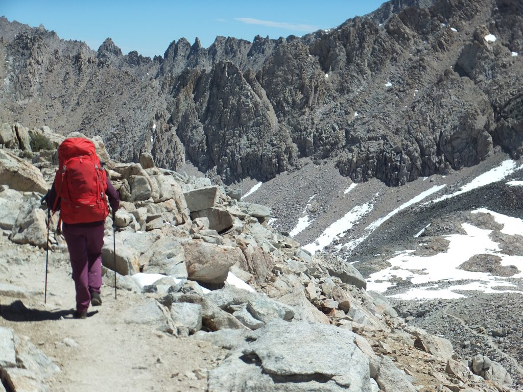 Vi lunchar vid vacker fjällbäck nedanför snögränsen. Vi följer senare Bubbs Creek, en bredare bäck/älv och korsar flera av dess tillflöden. Mycket vatten generellt sett i parken. Vi möter mycket folk. Den här delen av PCT ”delas” med John Muir Trail -en mycket populär led i high Sierras.