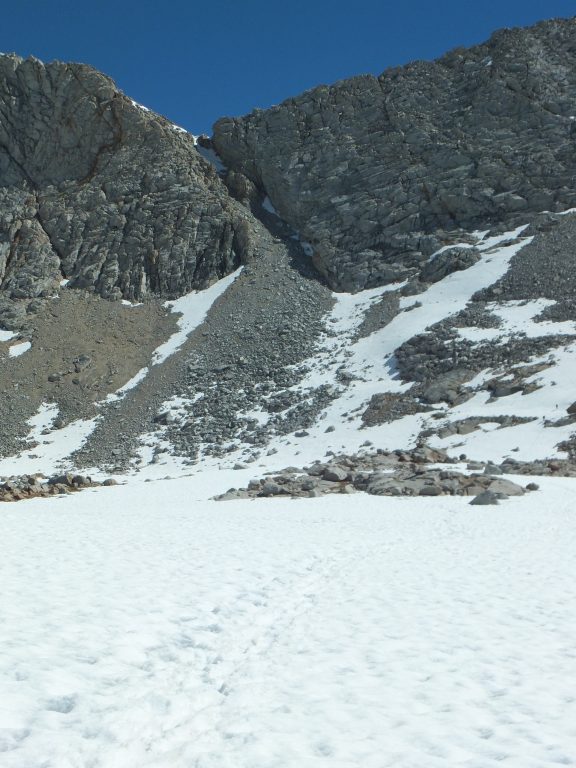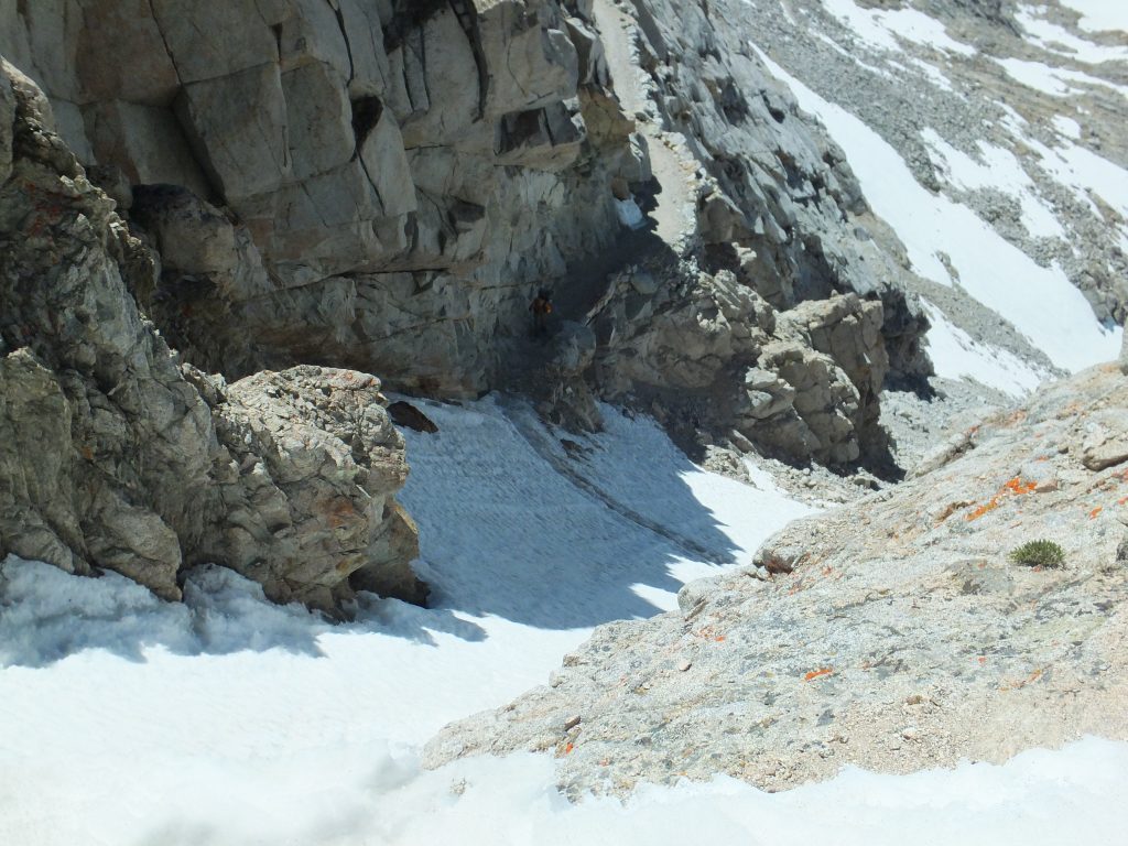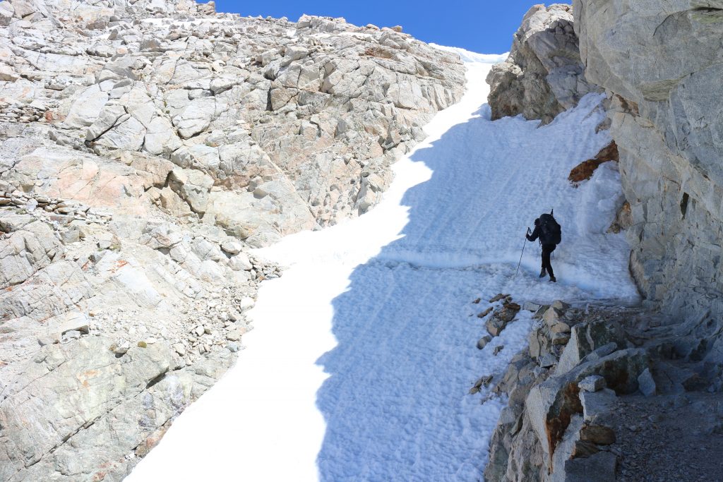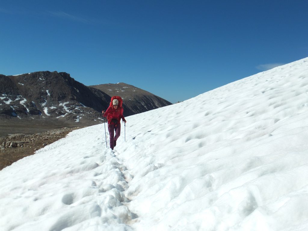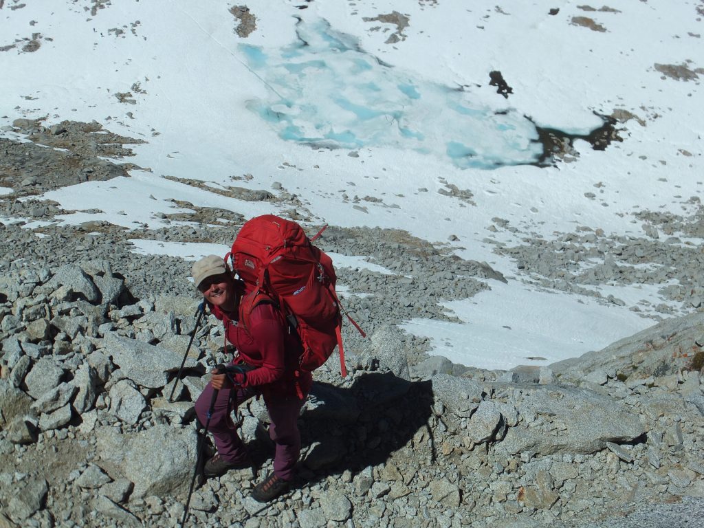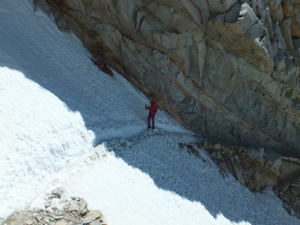 Går branten på snöpartier och serpentinstigar. Det är en smal skreva mellan bergen där passet ligger. Nära krönet så fick vi gå över ett kortare, brant snöparti, där man fick ha tungan rätt i mun.