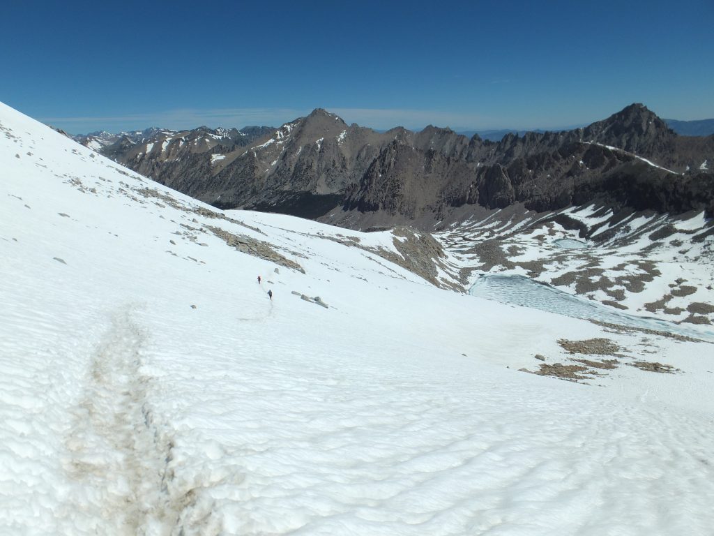 På andra sidan är det snörikare, men inte lika brant. Vi lämnar nu Seqoia national park och kommer in i Kings Canyon national park. Snön har blivit slushig, men det är lättgått.