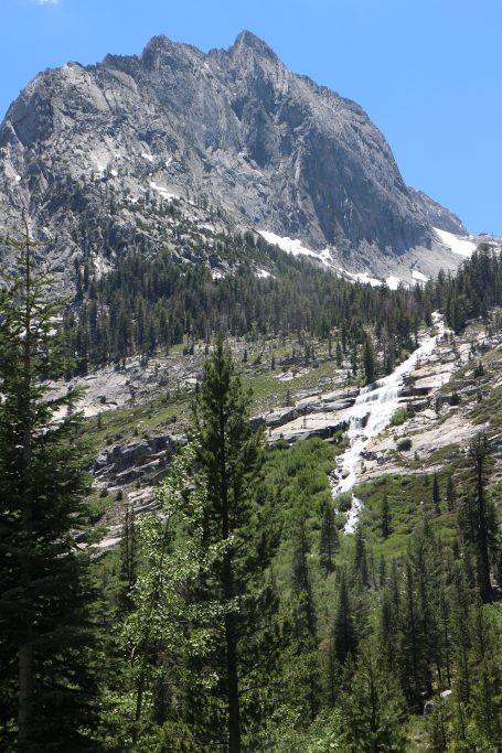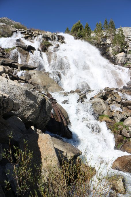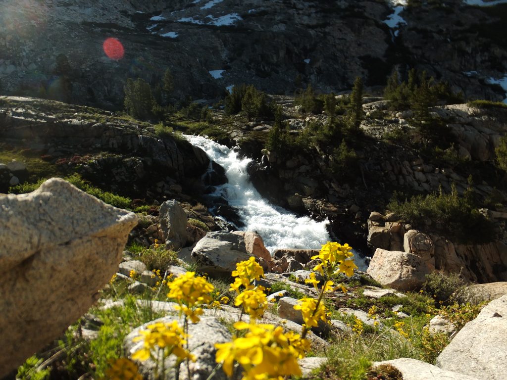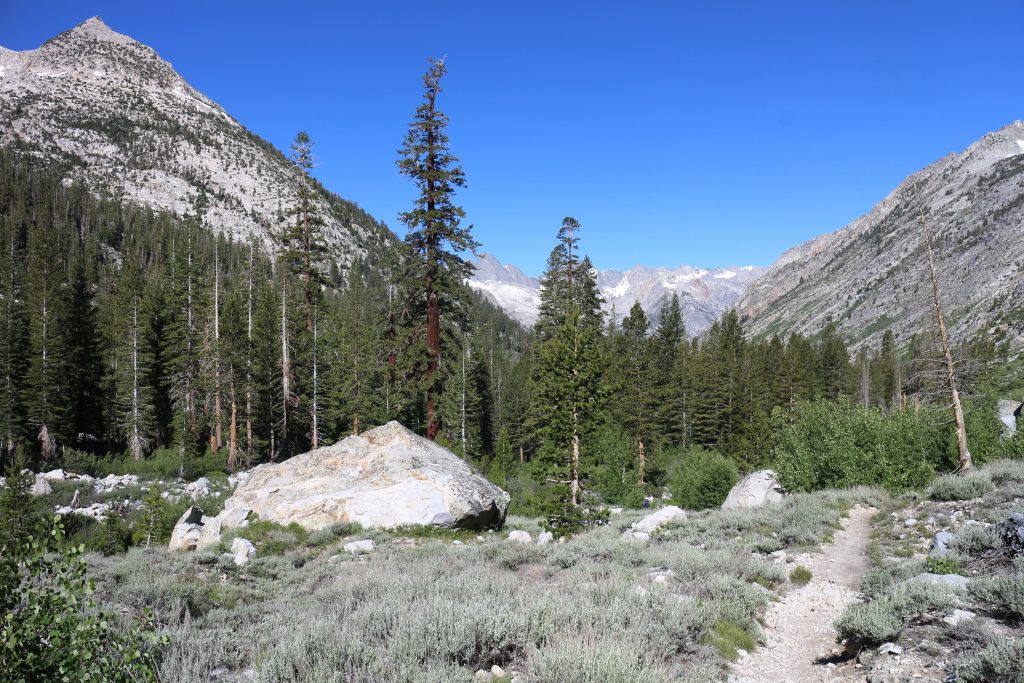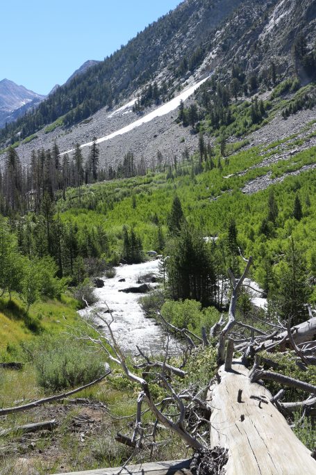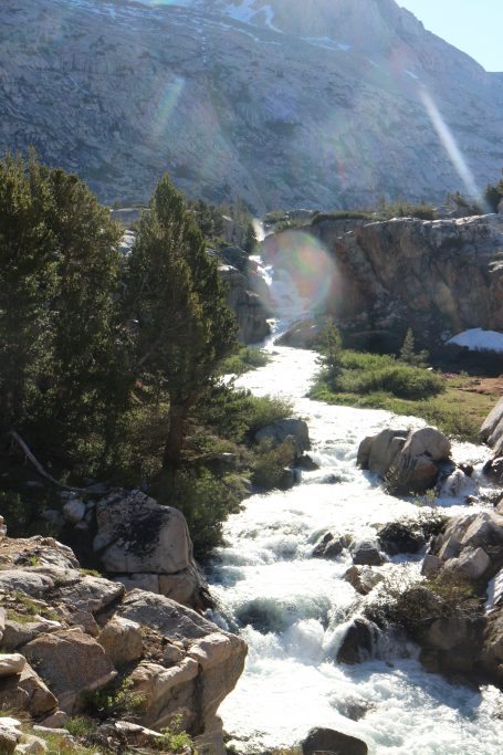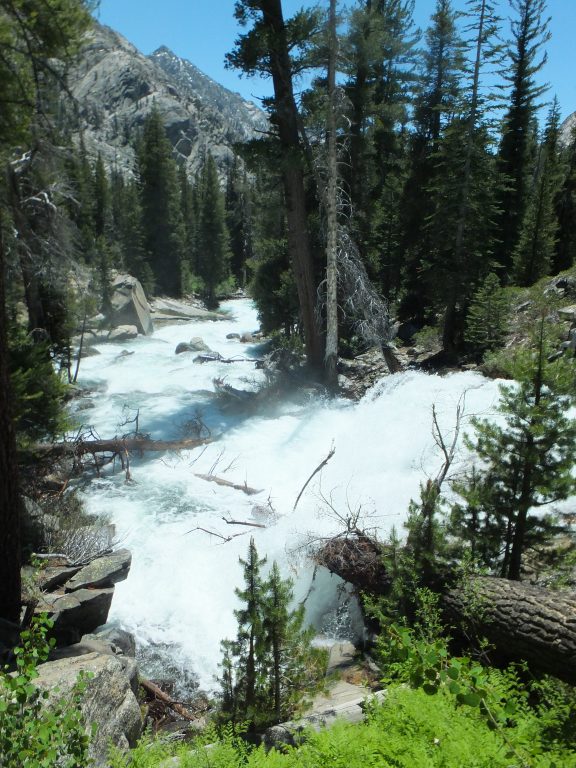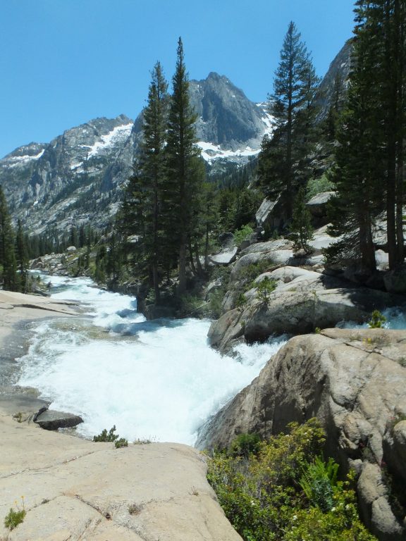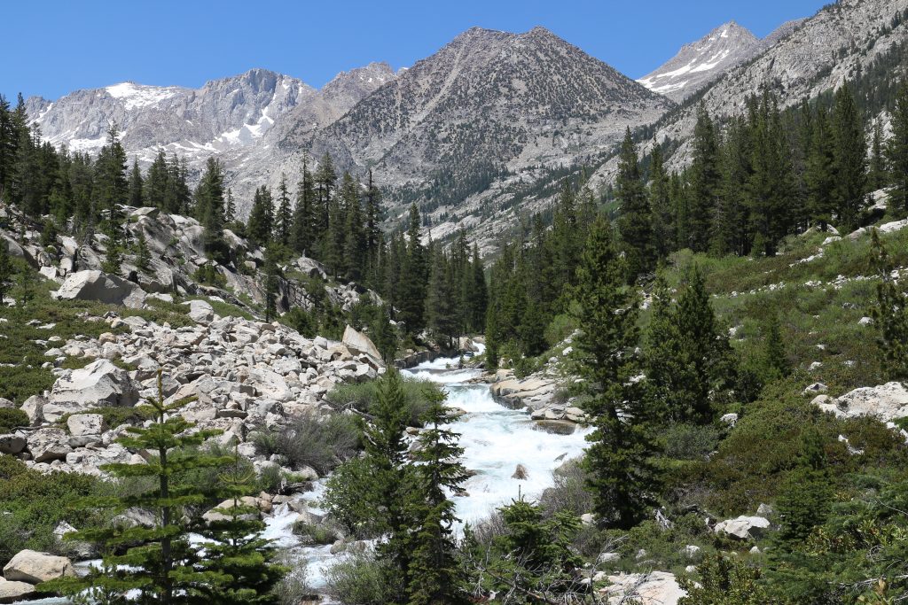 Lunchar strax efter att det vänder och börjar gå uppåt igen. Bishop pass Trail junction, 5,5 km bort blir nästa delmål. Möter en trevlig ranger. Följer ett annat vattendrag/fors uppströms och viker av på bishop pass Trail i närheten av ranger station.